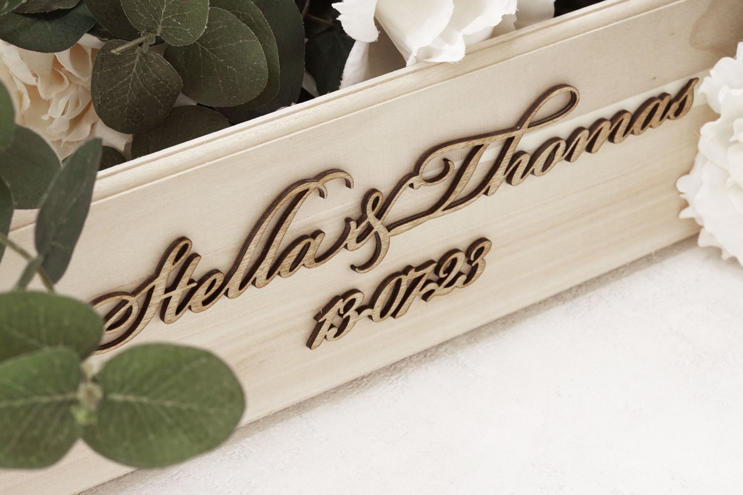 Fremhæv brudeparrets navne til reception eller bryllupsfest med et dekorativt unik skilt med udskåret navne i træ. Skiltet kan hænge eller stå efter ønske.
