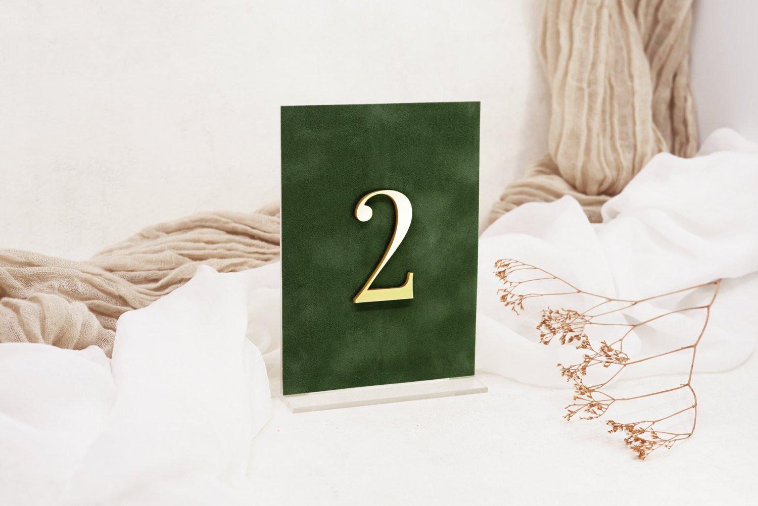 Hvis du har et ønske om et bryllup, hvor detaljerne er eksklusive og unikke, så er bordnumre i velour med udskåret tal, det rigtige valg. Du vælger selv både velour- og talfarve.