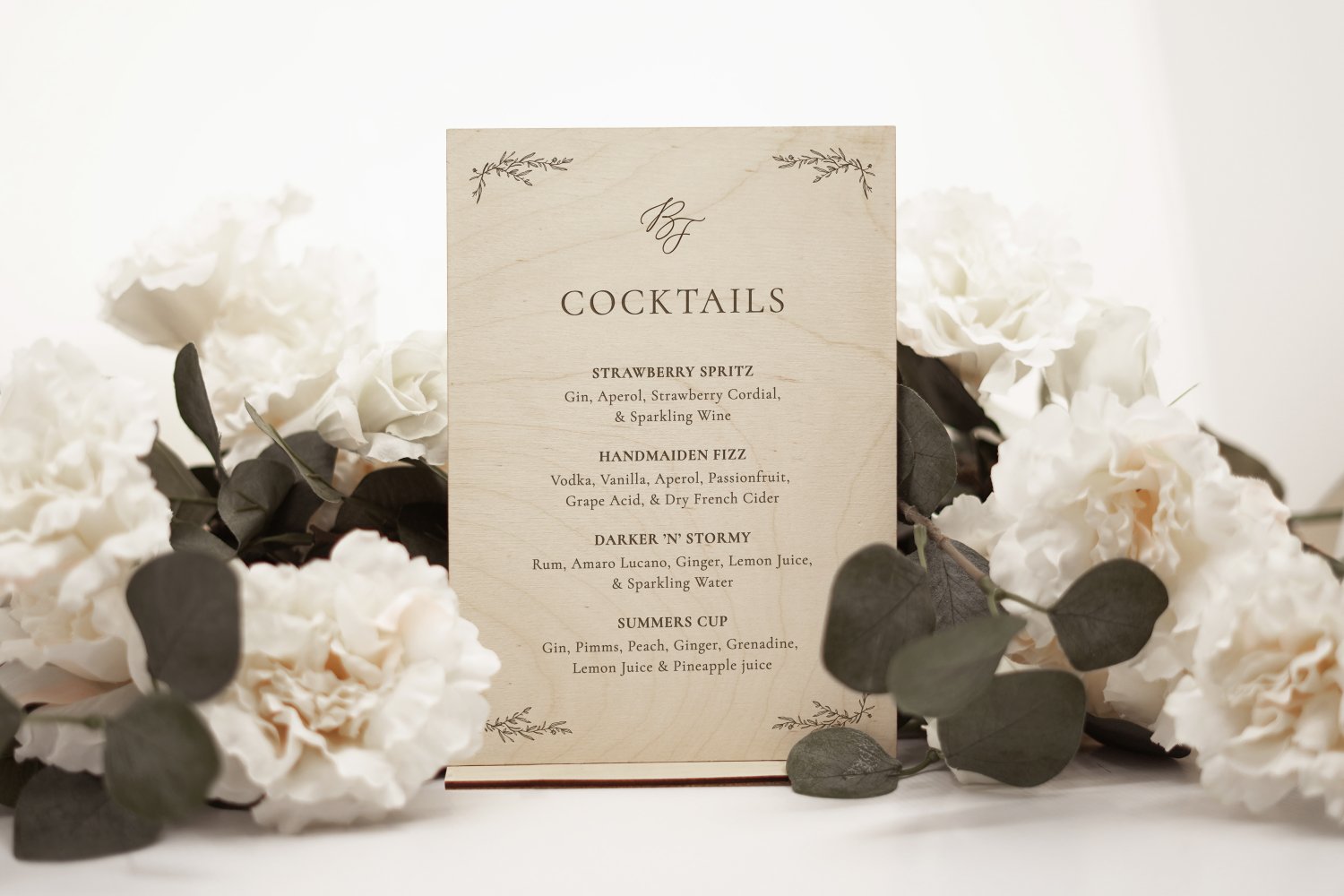 Dette personlige cocktailskilt i træ er den perfekte måde at præsentere og dele jeres egne signaturdrinks ved jeres bryllup. Det tilføjer en rustik og personlig detalje til bryllupsbaren og hjælper med at skabe en mindeværdig drinkoplevelse for jeres gæster.
