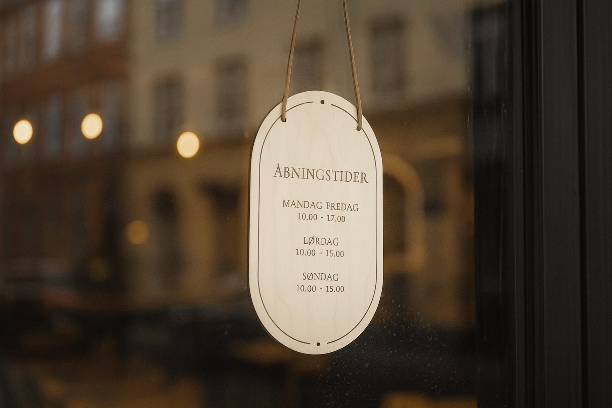 Skilt til butik eller virksomhed med info omkring åbningstider. Skilt kan fremstilles i valgfri træsort og skrift og hvis du ønsker at tilføje dit eget logo, er det også muligt.