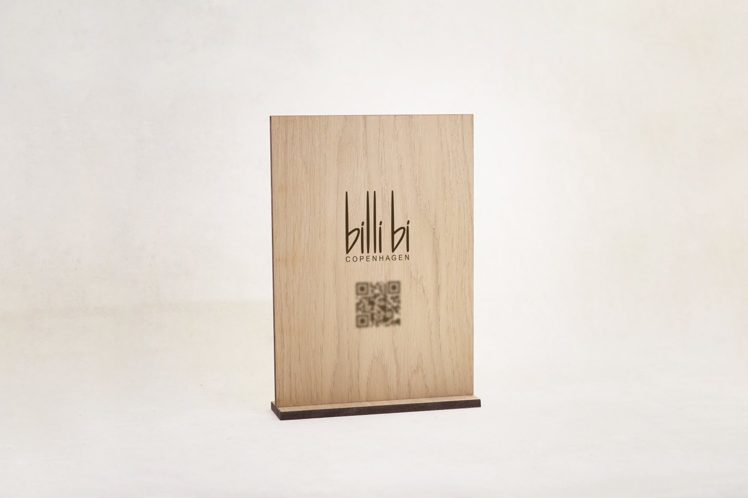 A5 QR-kode infoskilt i træ, perfekt til virksomheder, butikker og saloner. En stilfuld og funktionel løsning, der giver kunderne nem adgang til information, booking eller sociale medier.