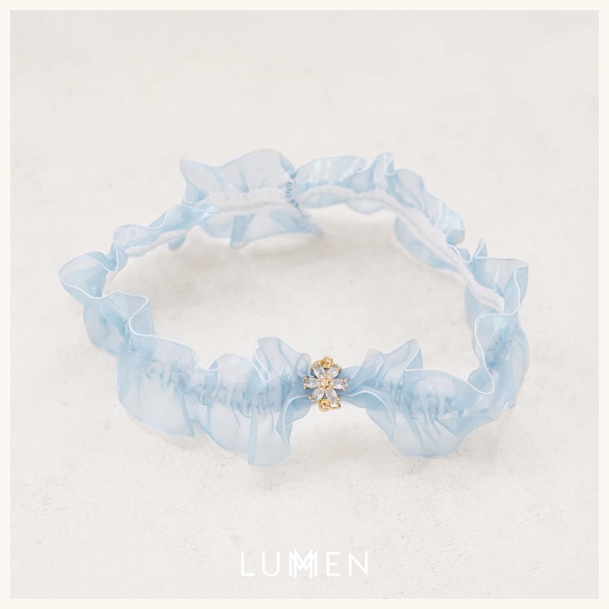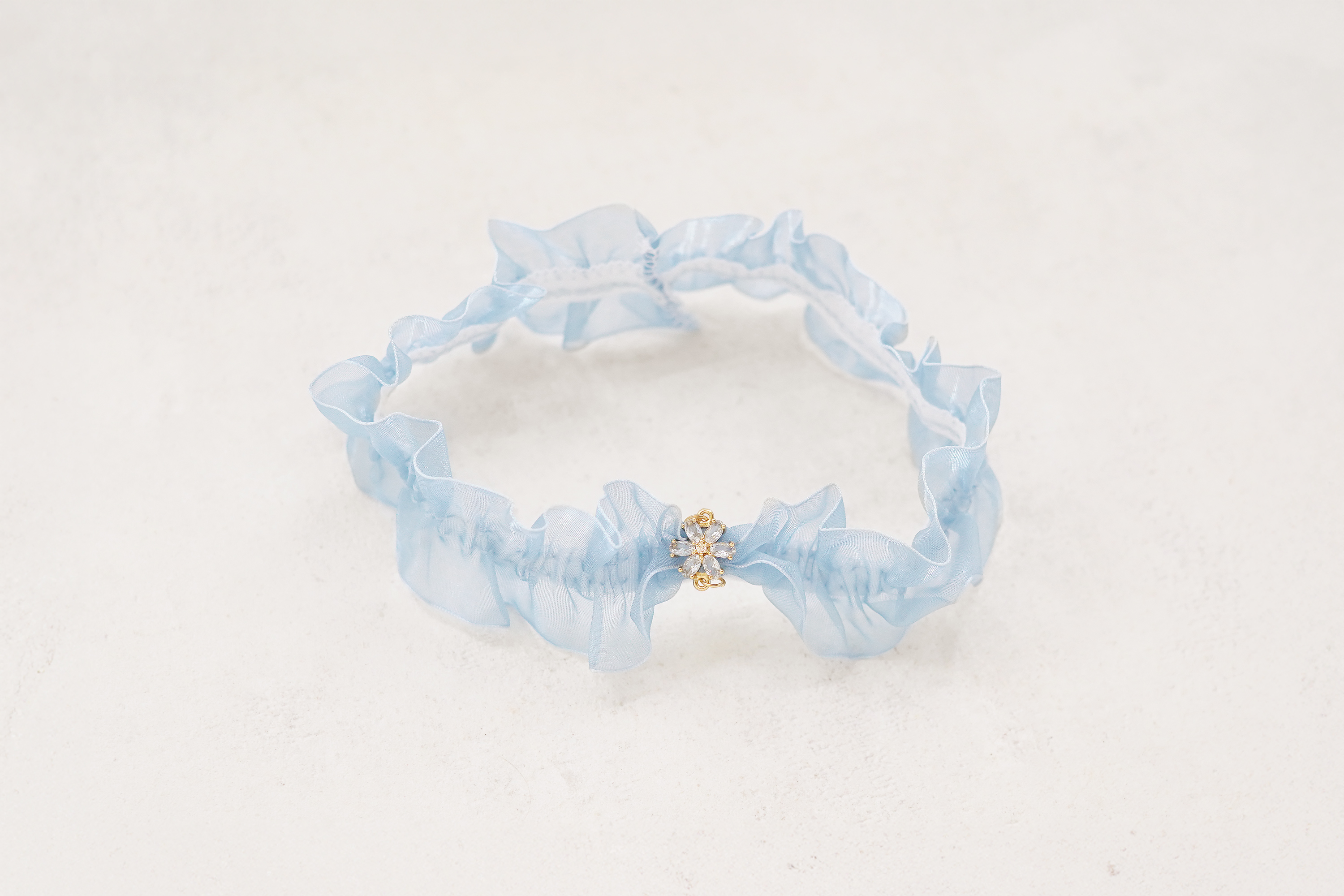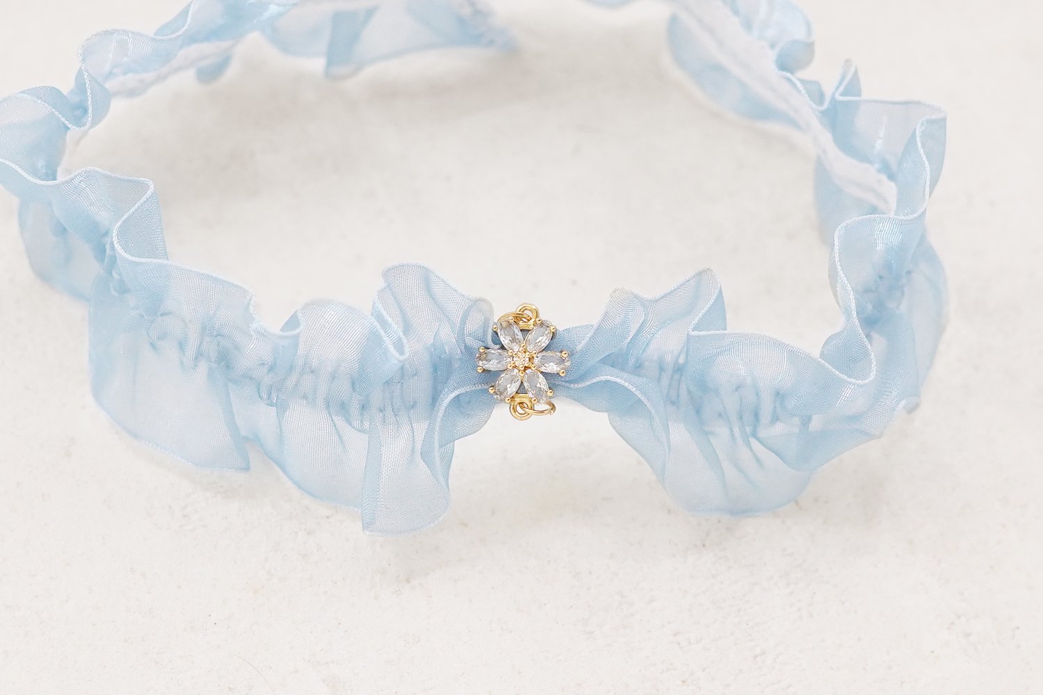 Feminint elastisk strømpebånd i blåt organza til bruden. Det lette, transparente materiale giver et romantisk udtryk, mens det fine vedhæng med krystalblomst tilfører et diskret og funklende detalje. Perfekt som “something blue” på den store dag.