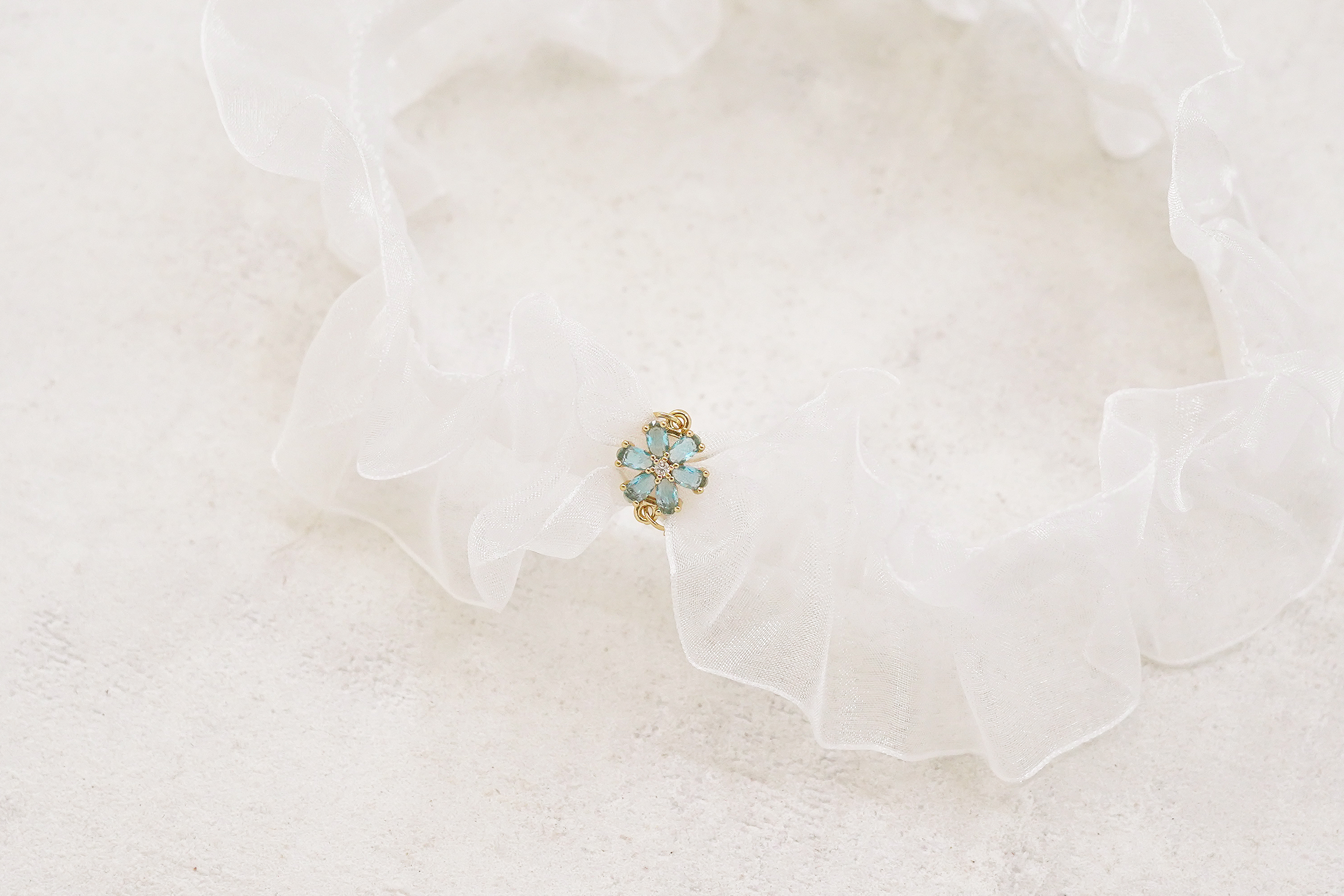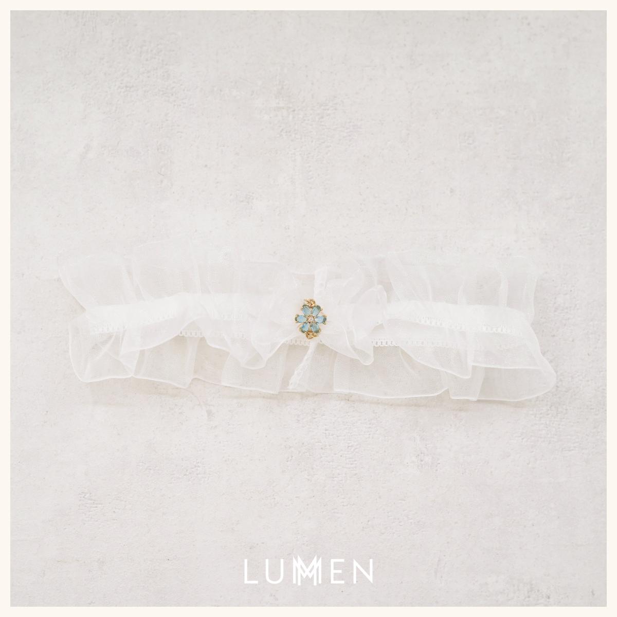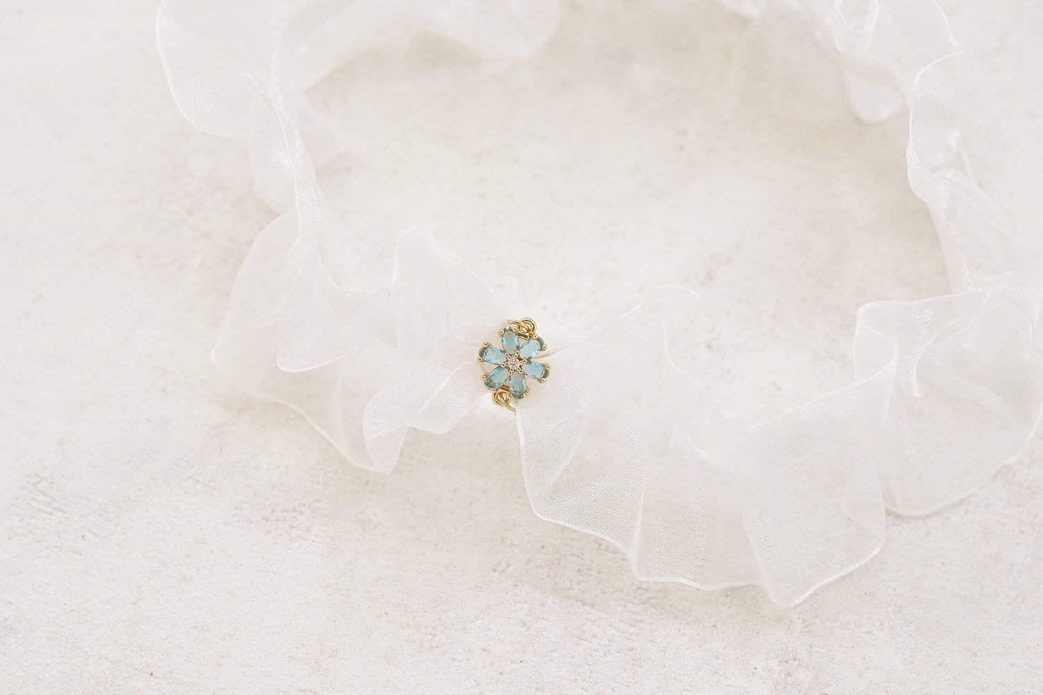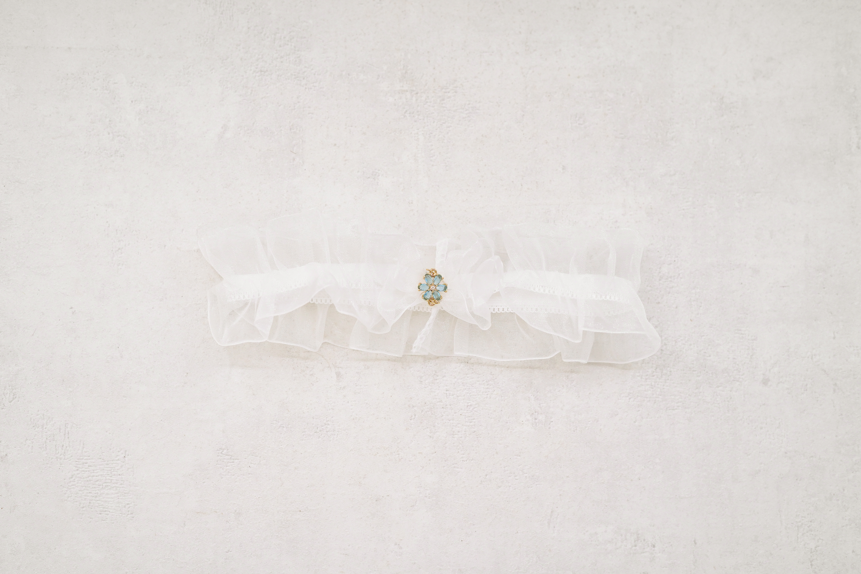 Elegant elastisk strømpebånd i hvid organza til bruden. Det lette, transparente materiale skaber et romantisk og luftigt udtryk, mens vedhænget med blå krystalblomst tilfører en fin, funklende detalje.
