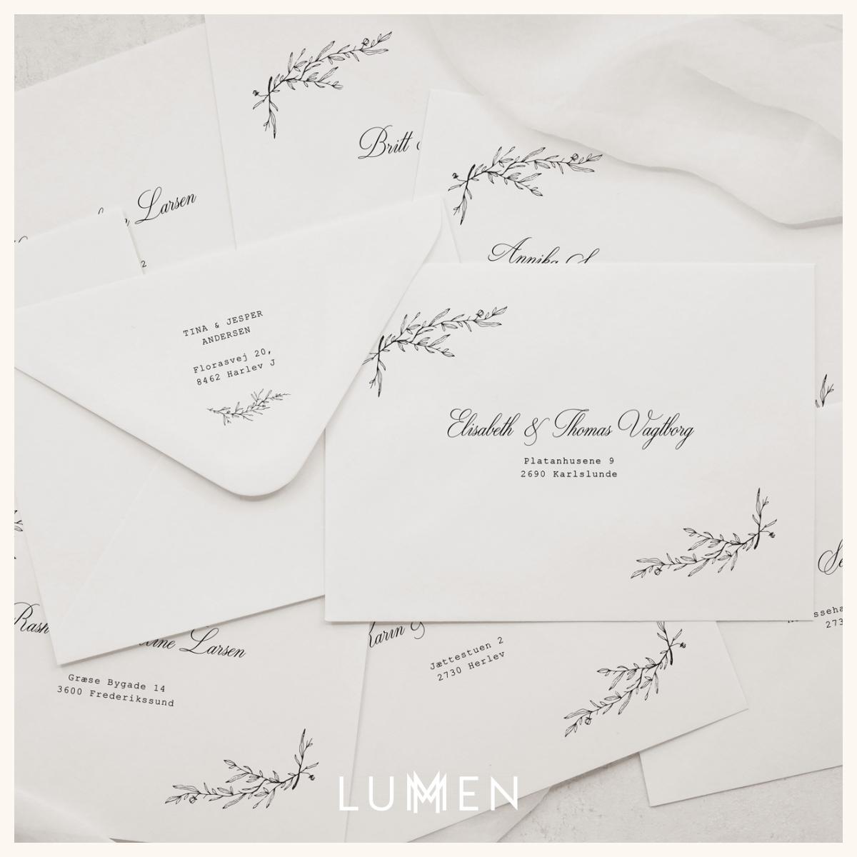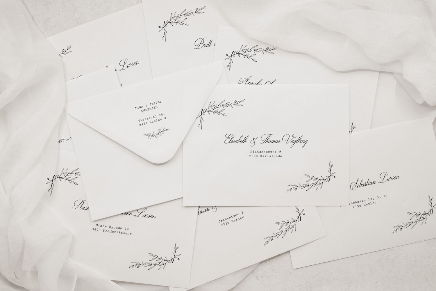 Adressetryk på konvolutter – en elegant detalje, der fuldender dit udtryk. Trykkes direkte på konvolutten og fås kun som tilkøb til én af vores invitationsserier.