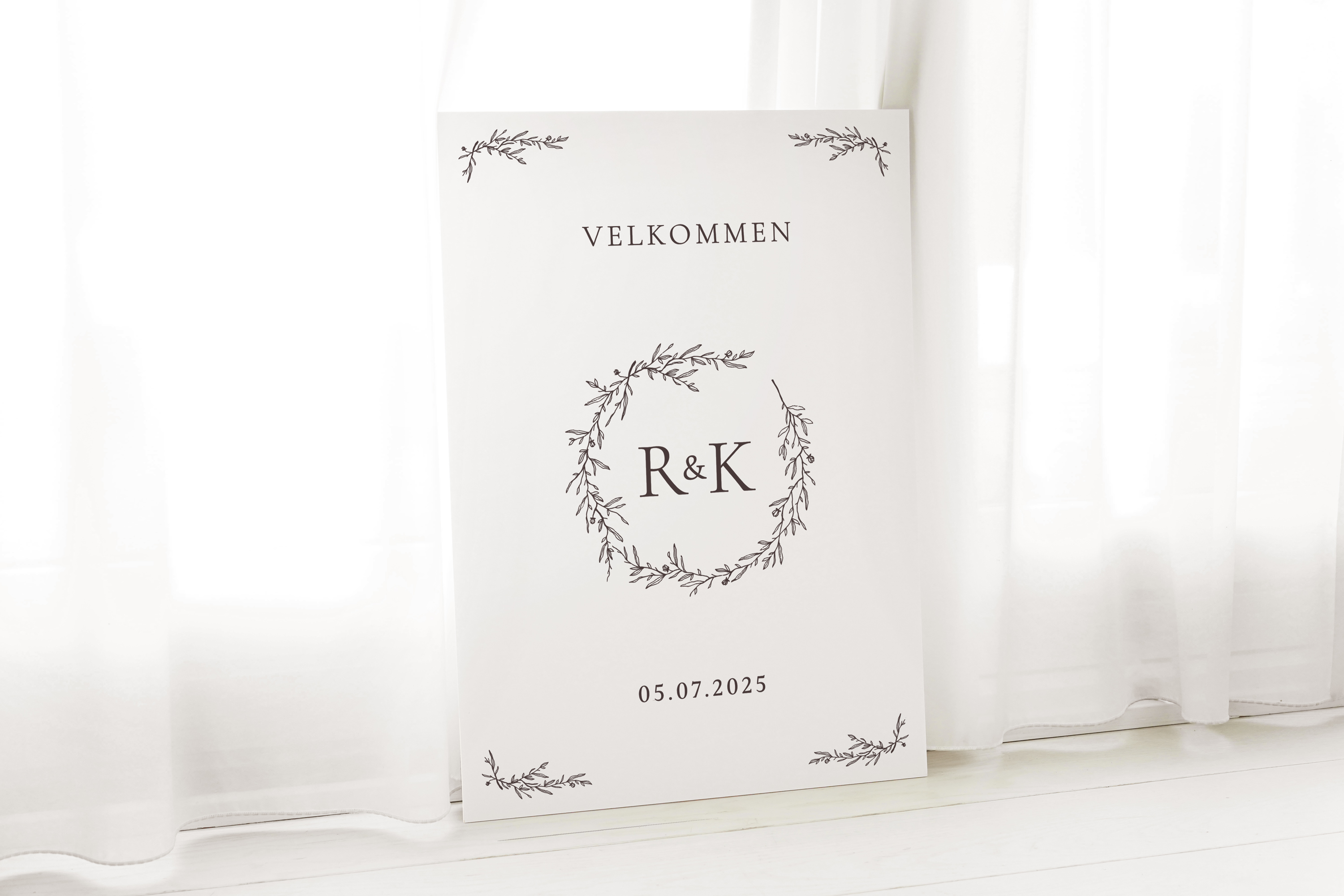 Byd gæsterne velkommen til vielse, reception eller bryllupsfest med et unik velkomstskilt, trykt med personlige tekst og håndtegnet blomsterkrans. Skiltet kan fremstilles horisontalt eller vertikalt efter ønske.