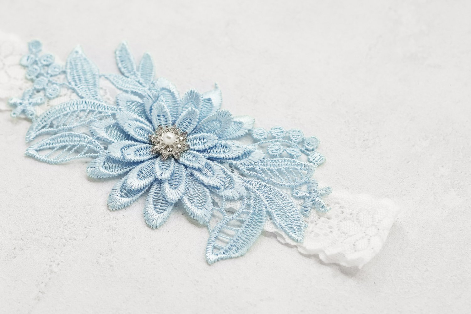 Elastisk blonde strømpebånd med broderet blomster og pyntet med små krystaller og perle. Strømpebåndet er håndlavet og fremstillet i Paris.
