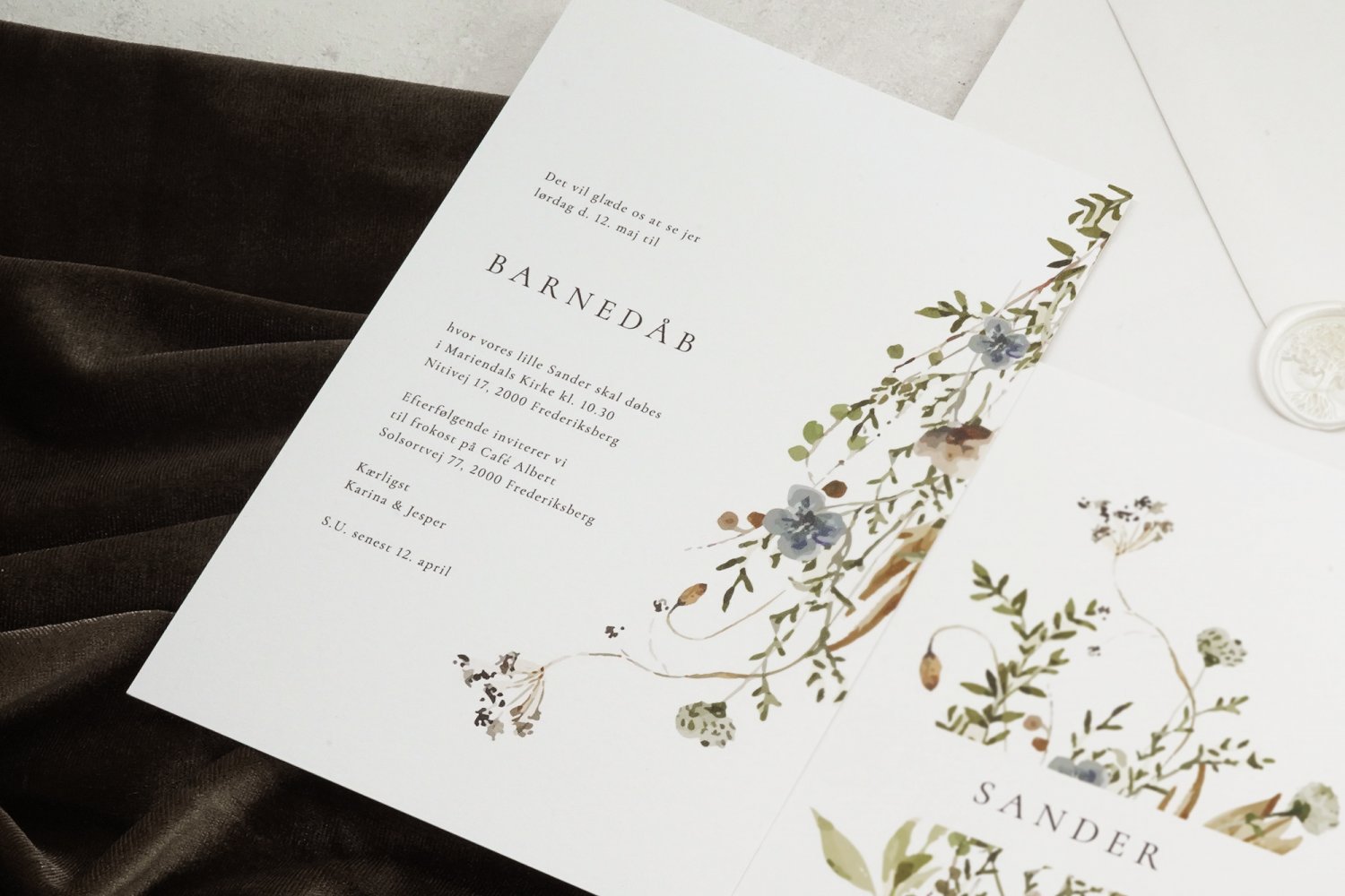 Skab en atmosfære af naturlighed omkring din babys dåb med vores håndlavede dåbsinvitationer med blå akvarelblomster. Disse invitationer er mere end blot papir, de er en måde at invitere dine kære til at deltage i en særlig begivenhed, der markerer dit barns første skridt ind i livet.