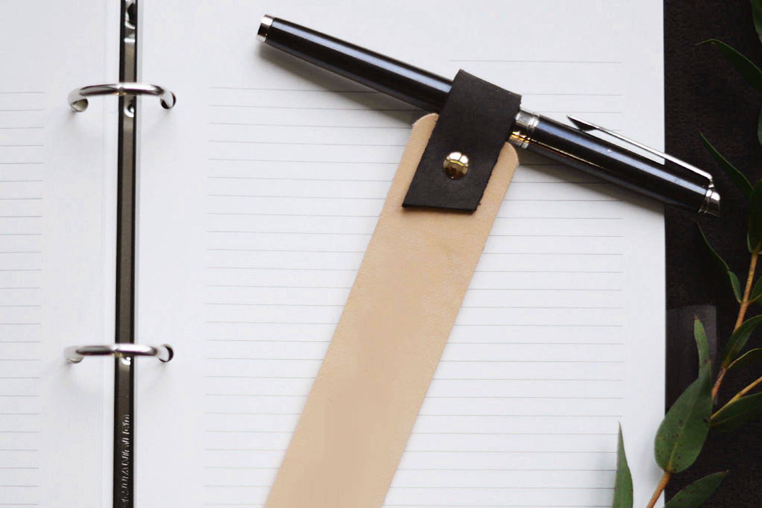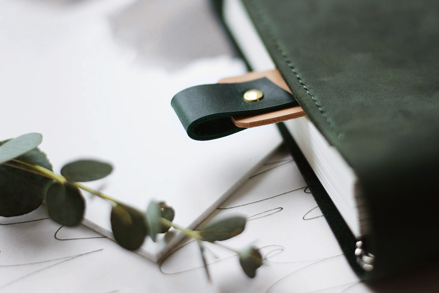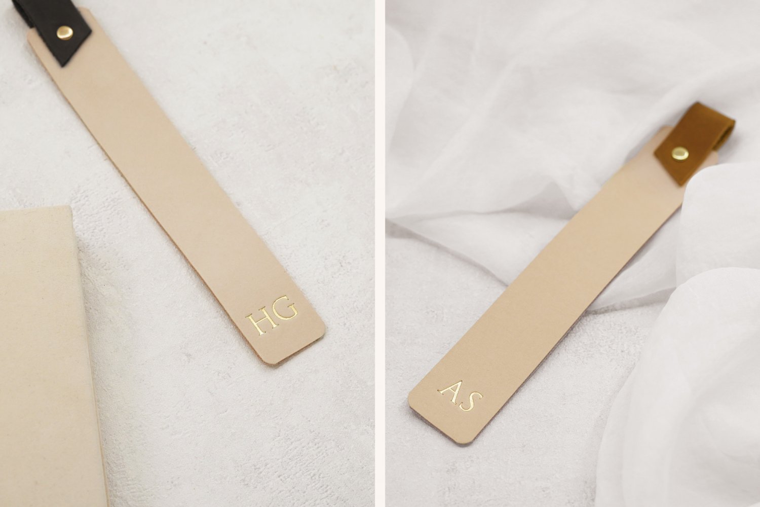 Bogmærker af ægte læder med prægede initialer efter eget valg, i valgfrie farver samt en løkke, hvor du kan indsætte din pen.