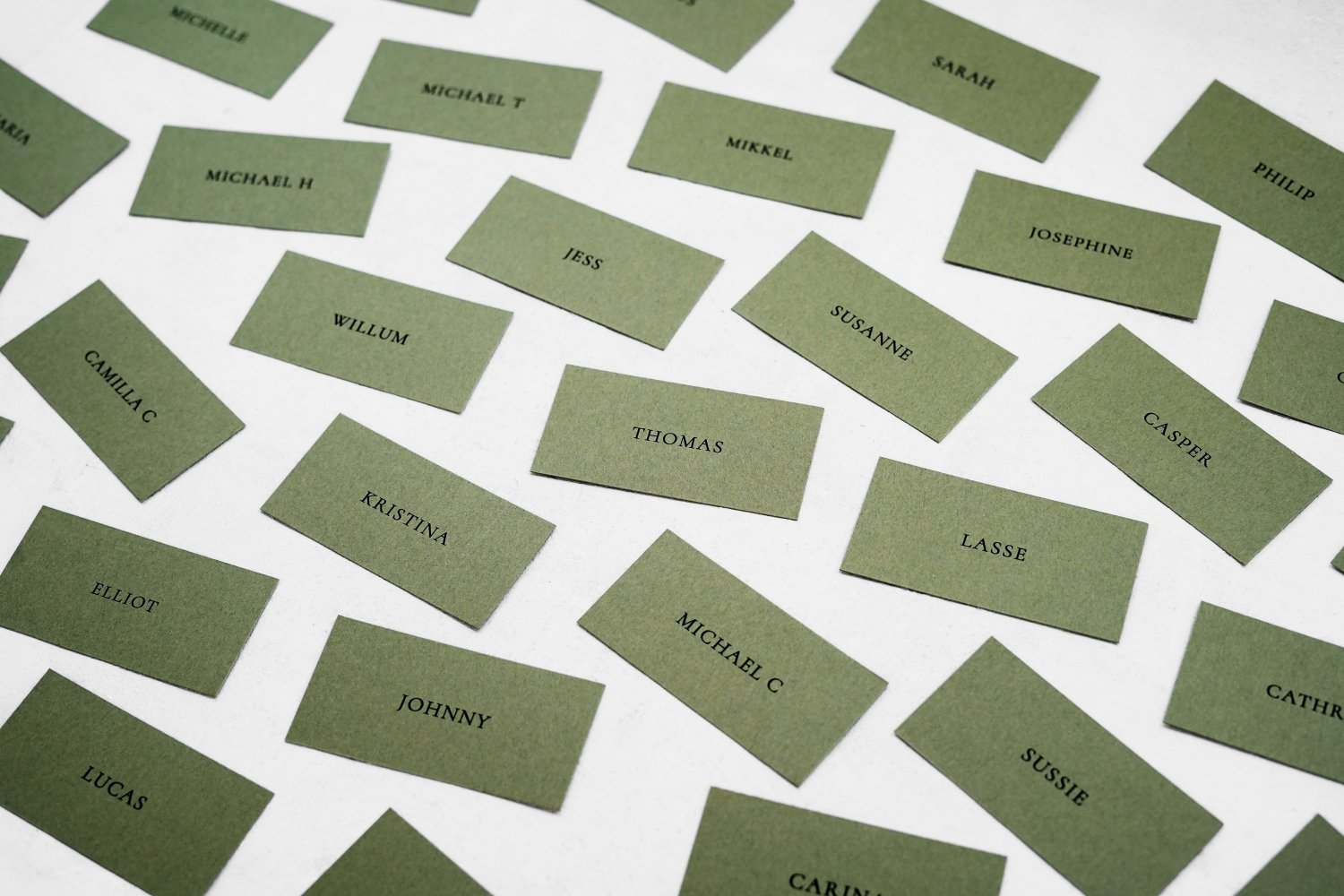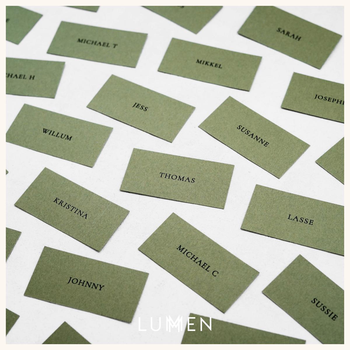 Elegante bordkort i olivengrønt karton. Den naturlige grønne nuance passer smukt til både romantiske, klassiske og moderne bryllupper og skaber en harmonisk helhed. Bordkortene kan tilpasses med navne og skrifttype, så de matcher resten af brylluppets stil.
