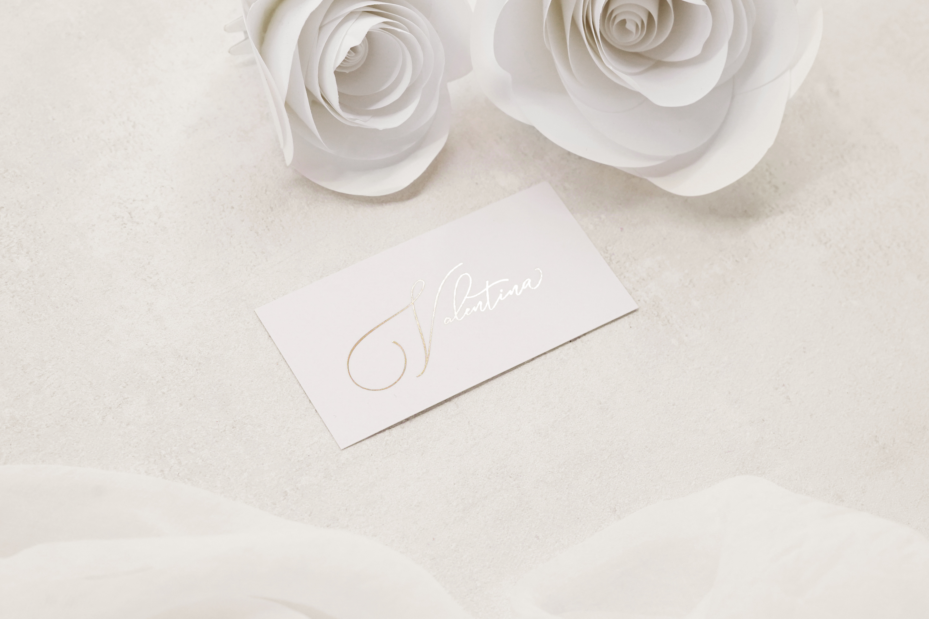 Bordkortene til dette bryllup er en hyldest til elegance med deres fortryllende kalligrafiskrift i gylden nuance. Hver bøjning og kurve i skriften udstråler luksus, hvilket tilføjer en tidløs charme til bordopdækningen.