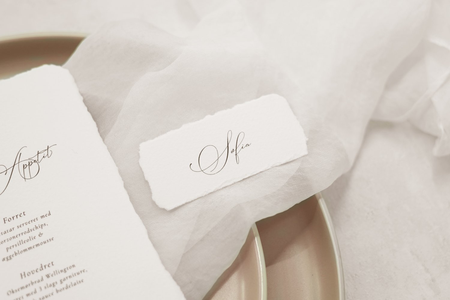 Bordkort med spinkel vintage kalligrafiskrift. Hvert bordkort personliggøres med gæstenavn og hul til bånd eller snor kan tilføjes. Til parret der ønsker elegante detaljer til bryllupsmiddagen.