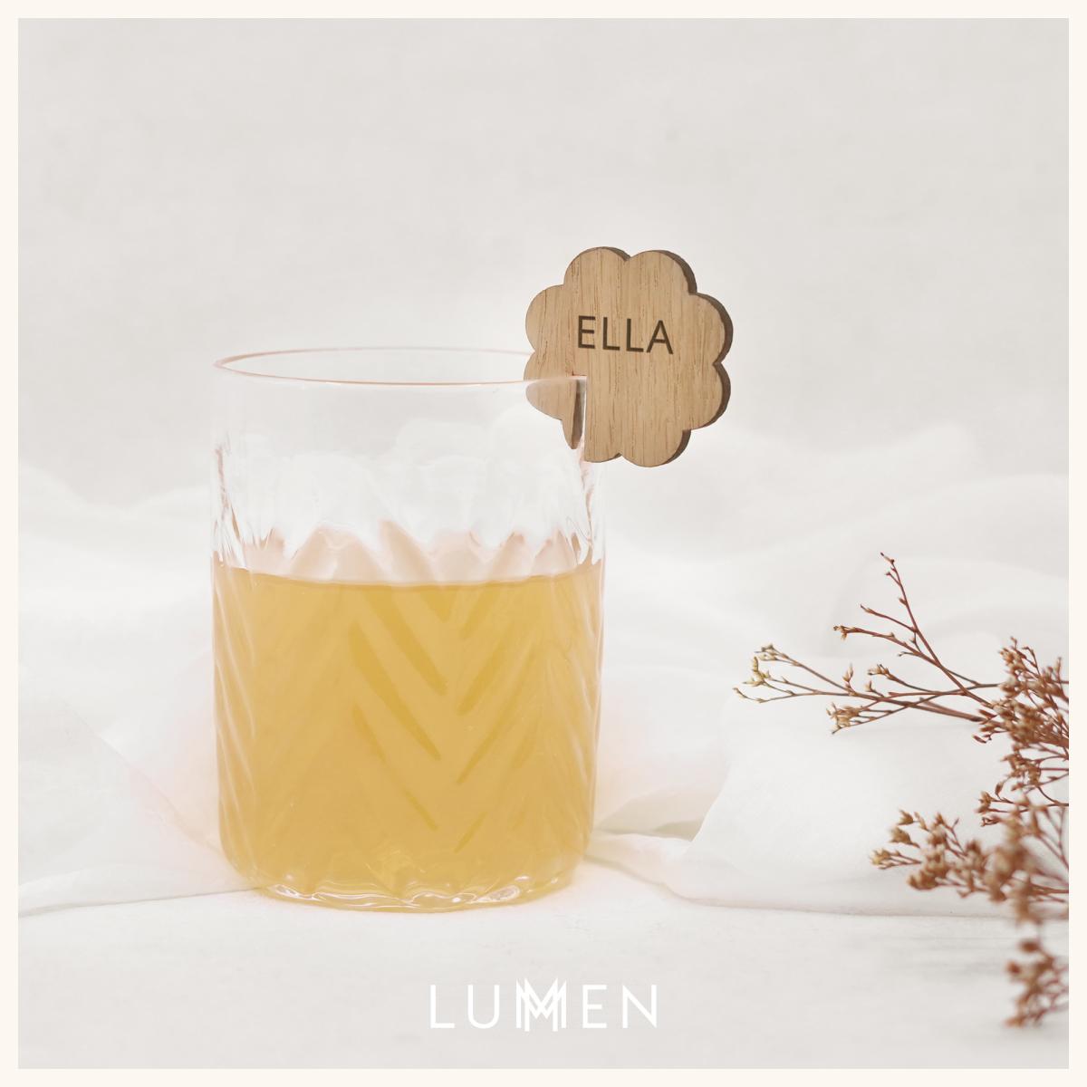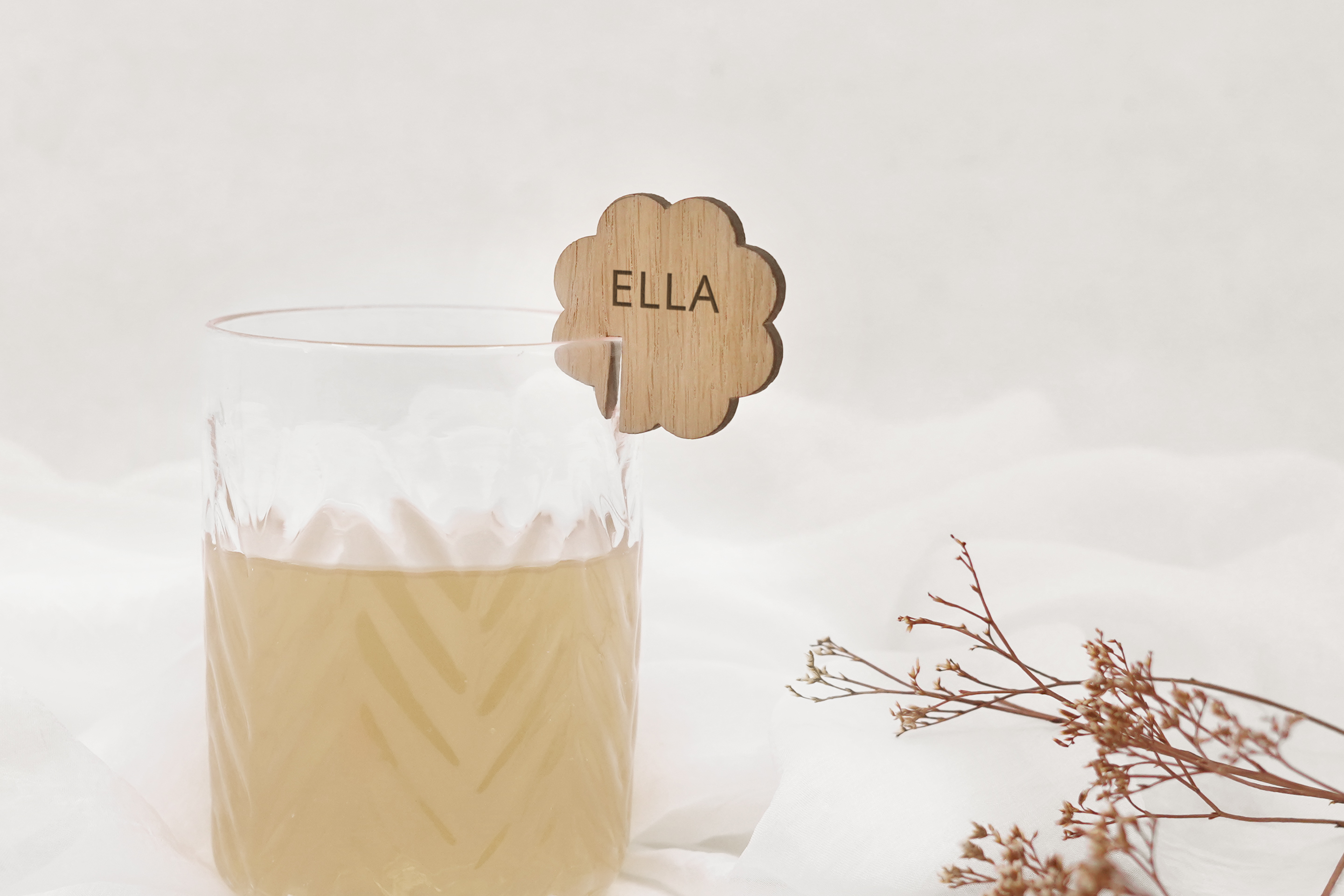 Bordkort i træ formet som blomst til at sætte på vinglas. Bordkortet personliggøres med gæstens navn, så det både guider og pynter ved borddækningen.