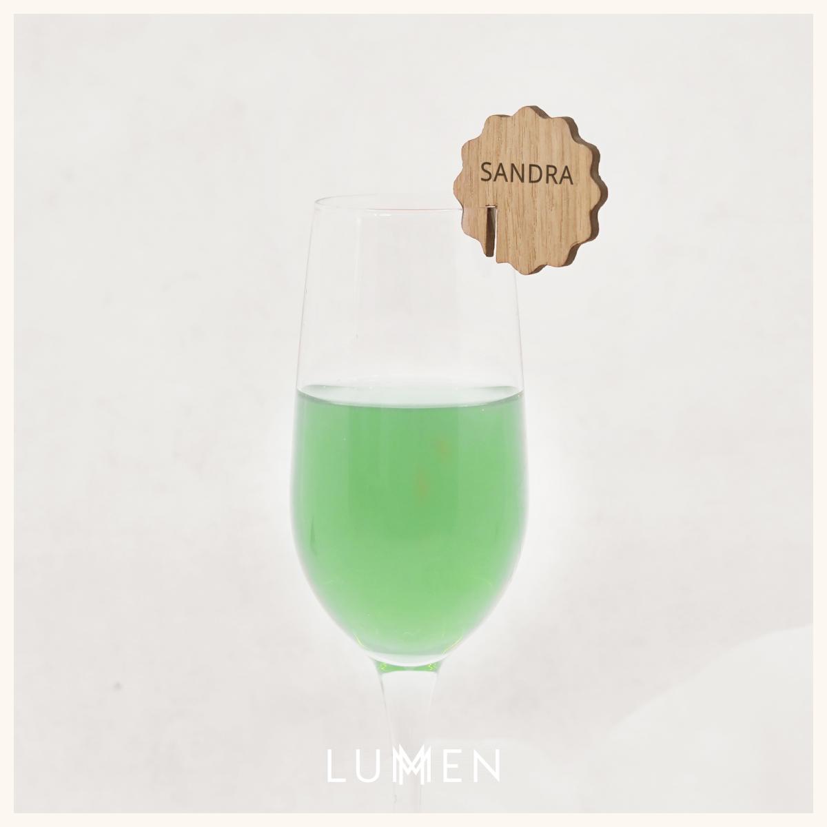 Bordkort med bølgekant, fremstillet i træ til at sætte. Bordkortet personliggøres med gæstens navn og sættes på vin- eller cocktailglasset.