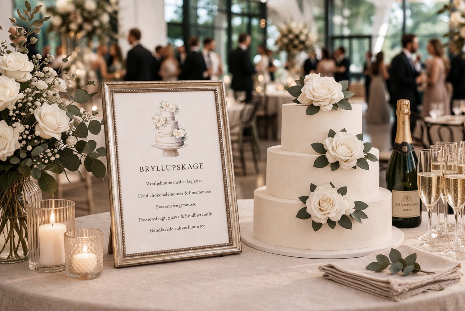 Dette elegante bryllupskageskilt er en smuk detalje til bryllupsreceptionen. Med en illustration af en bryllupskage, som kan vælges fra grafikoversigten, så det passer til netop jeres bryllup og tilbyder en personlig detalje til kagebordet.