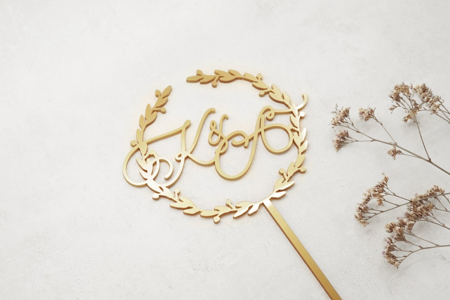Prikken over i'et til bryllupsreceptionen. Cake topper af akryl med bærkrans, som personliggøres med brudeparrets initialer. Kagetoppen måler som standard ca. B 12 cm (afhænger dog af type og navnevalg), men kan reguleres lidt efter ønske.