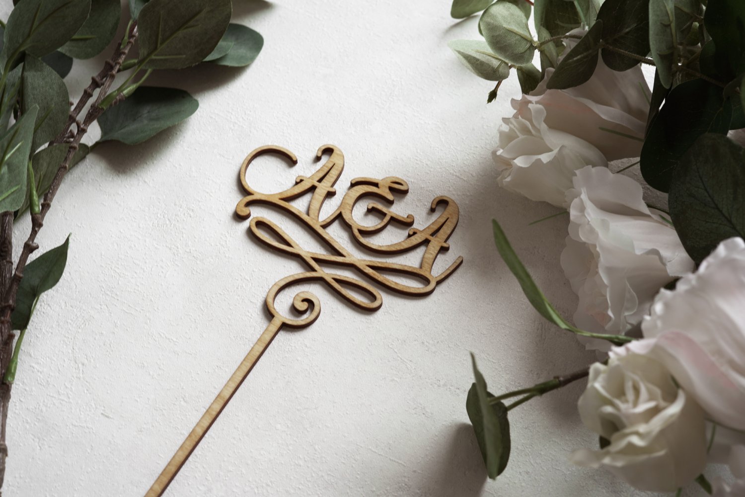 Få en romantisk detalje til bryllupskagen med en unik cake topper i træ, som personliggøres med brudeparrets initialer i håndskrift. Stilken måler 0,5 x 8 cm.