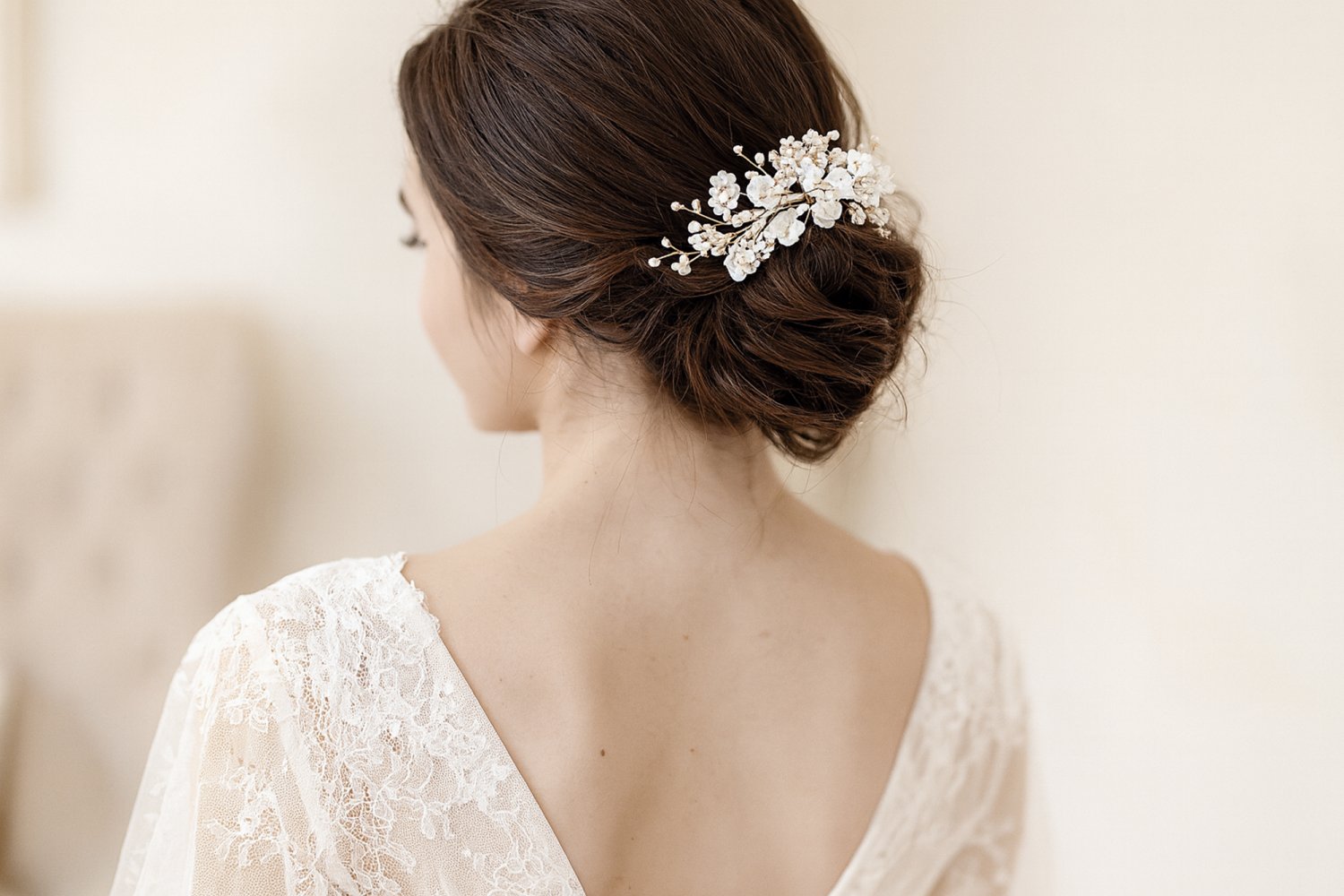 Fremhæv din skønhed med vores delikate hårkam, udsmykket med enkle hvide blomster af mat porcelæn og små perleklaser. Denne smukke håraccessory tilføjer et strejf af elegance og ynde til din frisure på din store dag.