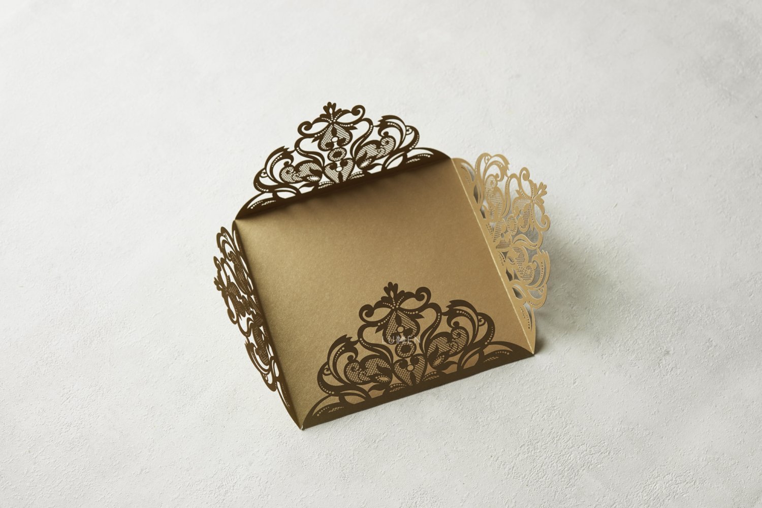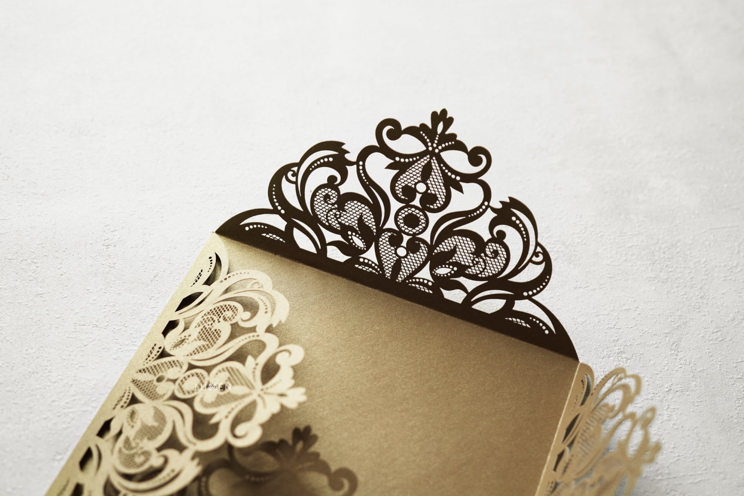 Dekorative omslag til bryllupsinvitationerne, som har et detaljeret laserskåret mønster, og er udskåret i 300g perlemor karton, som har en skinnede effekt når lyset rammer.