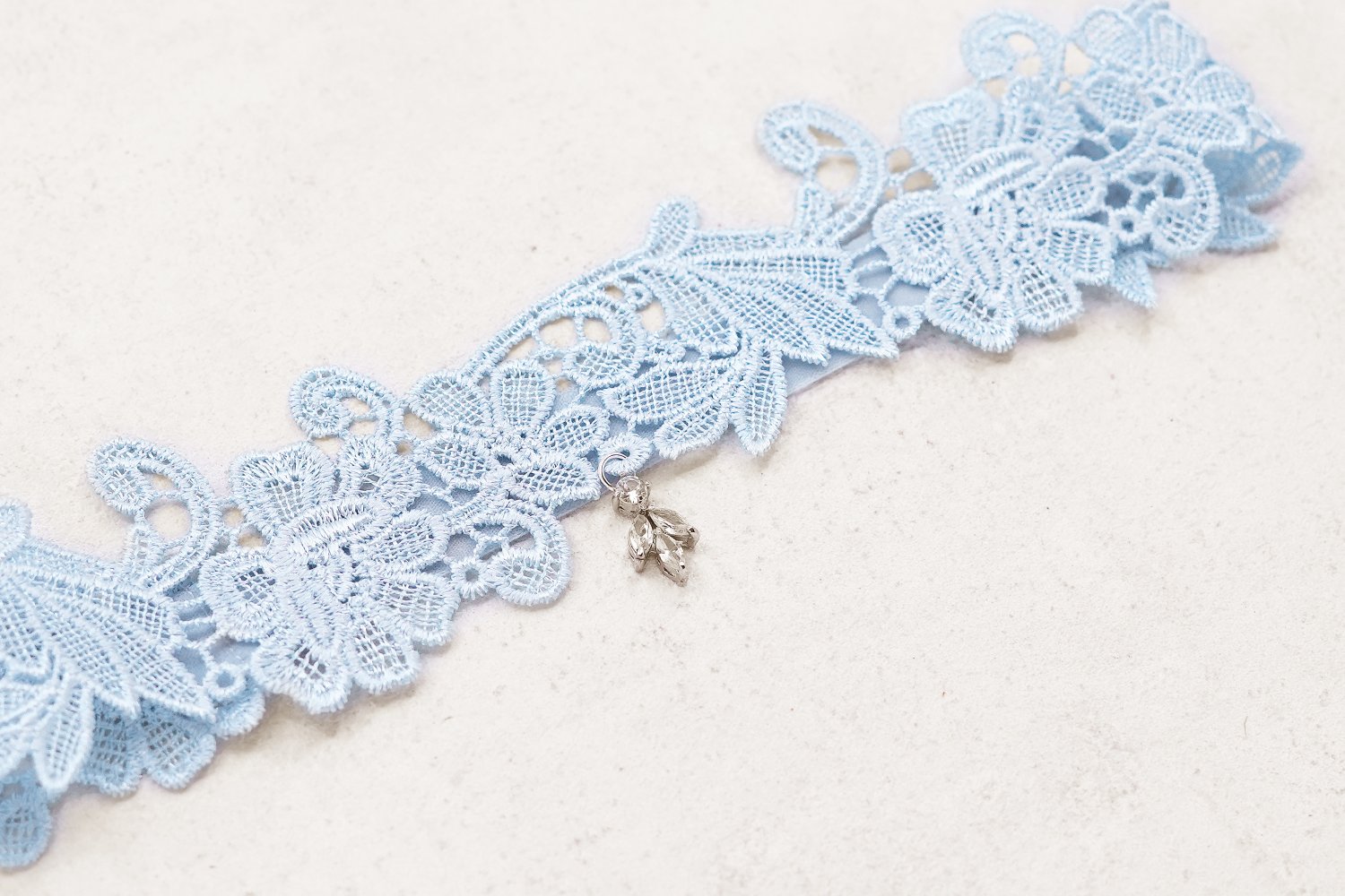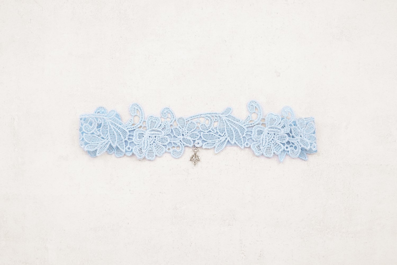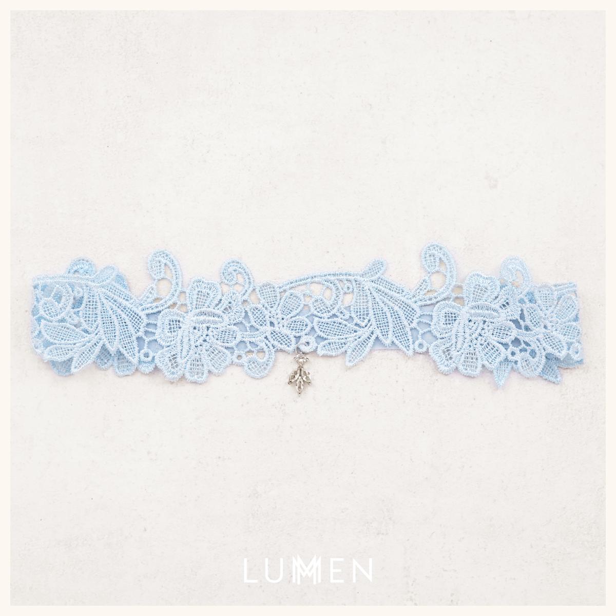 Elegant broderet blåt strømpebånd til bruden, udført i fine materialer og pyntet med et krystalvedhæng, der tilfører et eksklusivt og romantisk udtryk. Et smukt og traditionelt accessory til bryllupsdagen. Strømpebåndet er designet af Lumen.