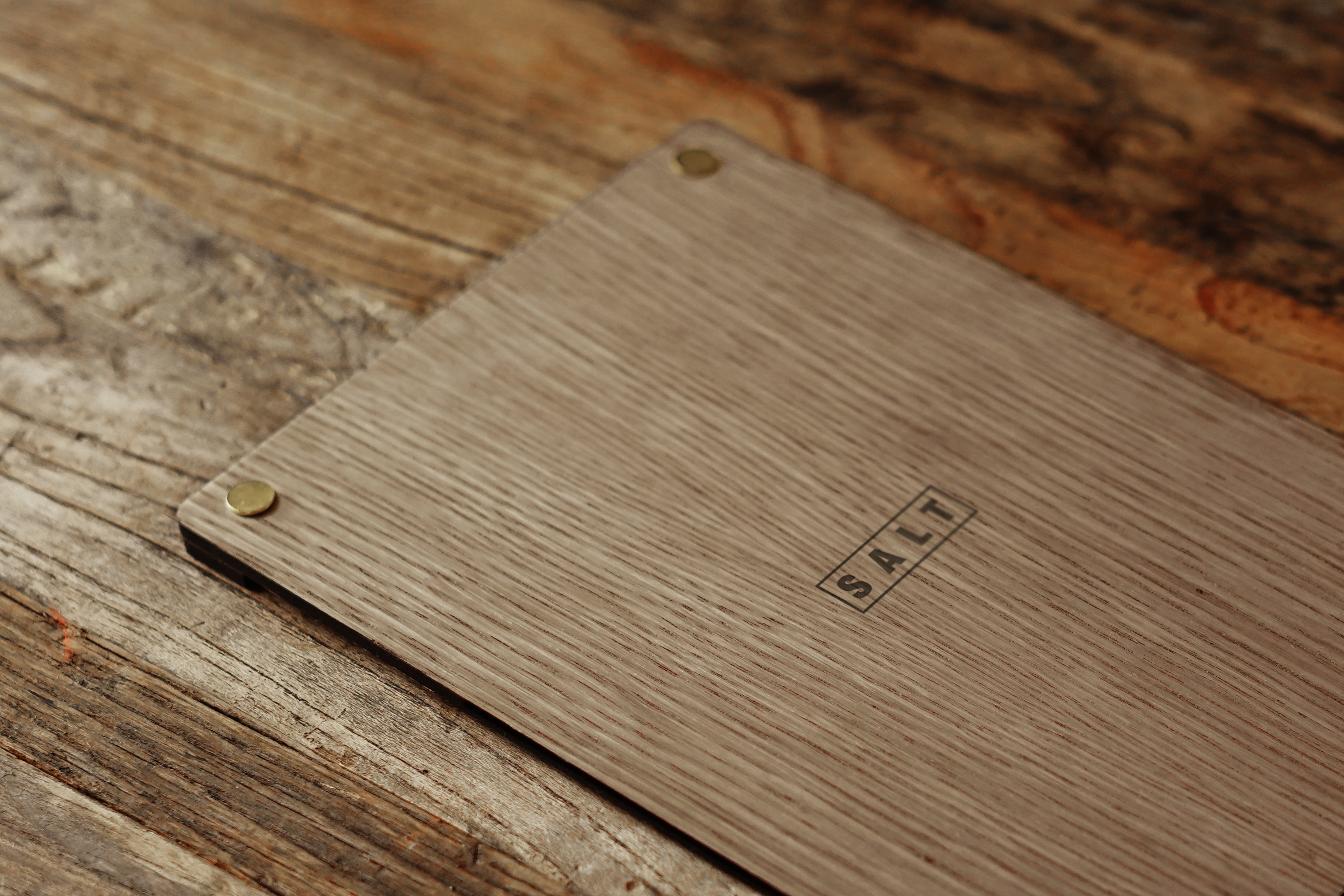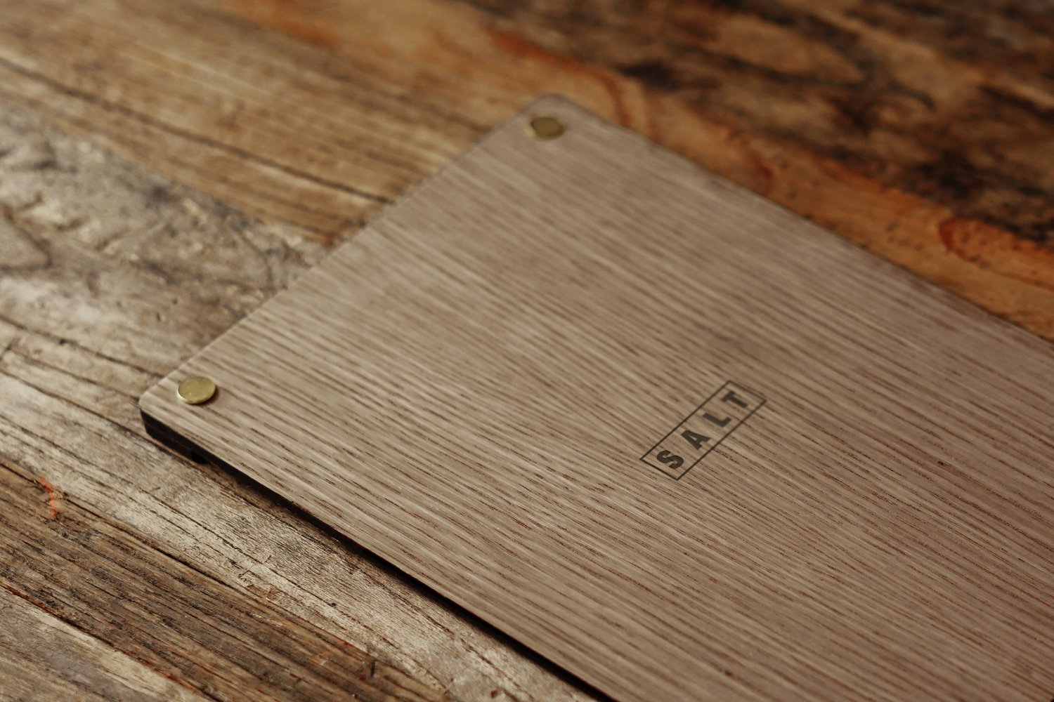 Håndlavet cocktailholder i træ med stabil fod, designet til restauranter og caféer. Drinks-menuen holdes elegant på plads med messingnitter, som nemt kan skrues af, når cocktailkortet skal udskiftes. Kombinationen af naturligt træ og rå detaljer giver et eksklusivt og tidløst udtryk. Logogravering på bagside kan tilføjes.