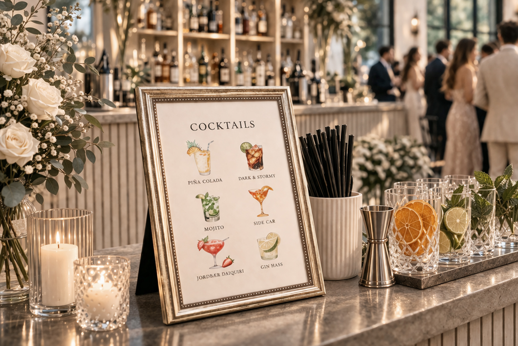 Farverigt cocktailskilt med valgfrie drinksgrafikker, indrammet til bryllup. Rammen kan både stå eller hænge og tilføjer en livlig og festlig detalje til jeres drinksbord.