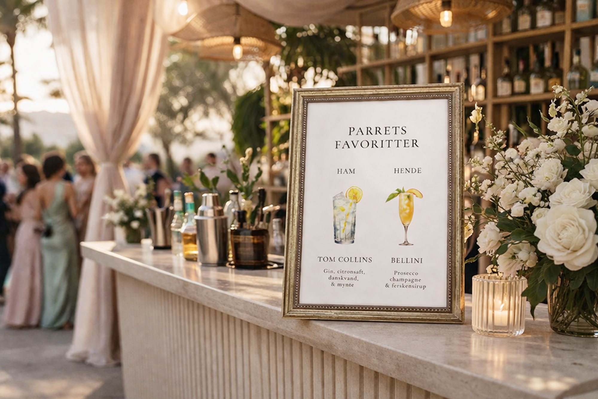 Dekorativt drinksskilt med cocktails i akvarel, der pifter enhver fest op! Cocktail-skiltet trykkes med valgfrie drinks og tilhørende illustrationer, så det passer til netop jeres fest. Skal der tegnes andre illustrationer, tilkøbes ekstra Grafisk arbejde »