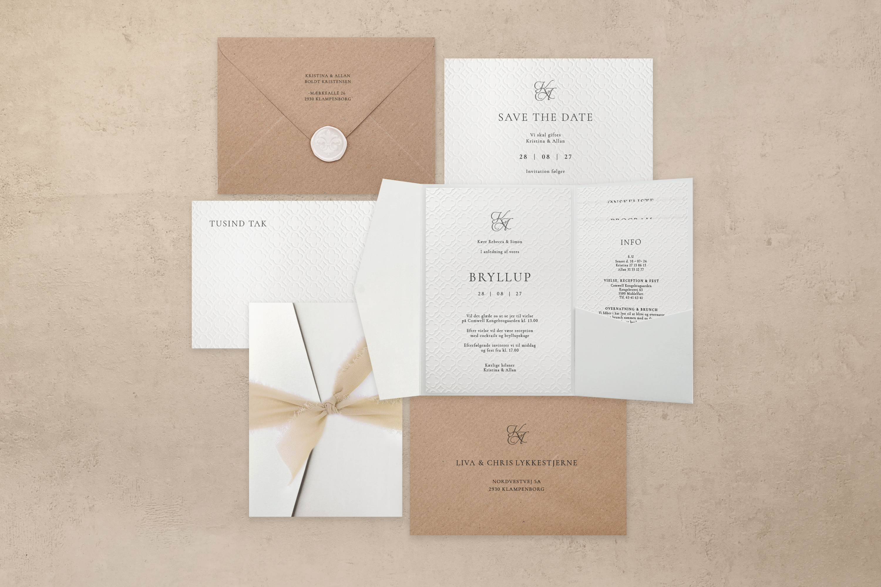 Save The Date kort lavet af luksuskarton, der giver et sofistikeret og elegant indtryk. Du kan vælge et valgfrit præget mønster, der tilføjer en personlig og unik detalje til kortet, perfekt til at annoncere jeres bryllupsdato med stil.