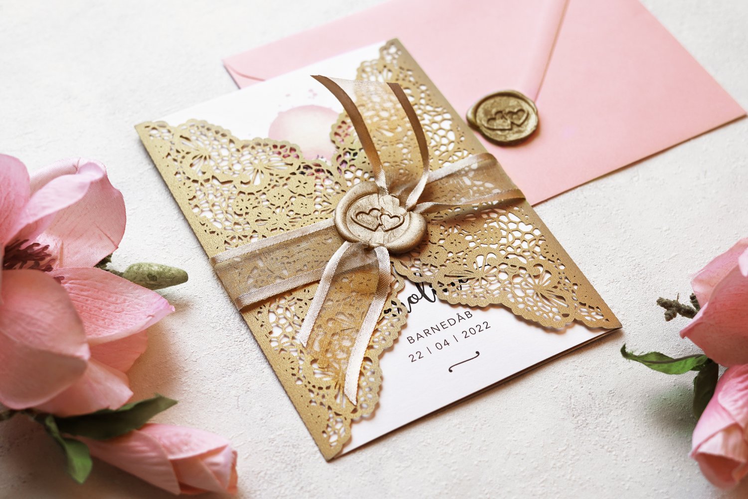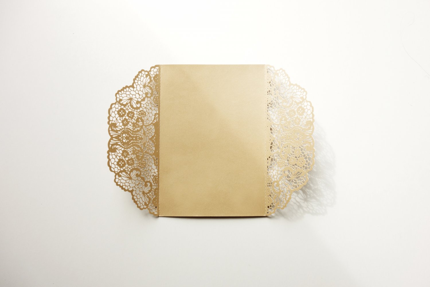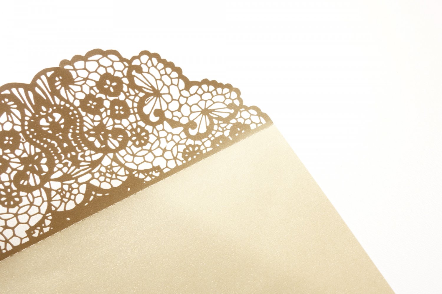 Gør lidt ekstra ud af bryllupsinvitationer med et dekorativt omslag. Invitationscoveret har detaljeret blomstermønster, og er udskåret i 300g gyldent perlemor karton, som har en skinnede effekt når lyset ramme.