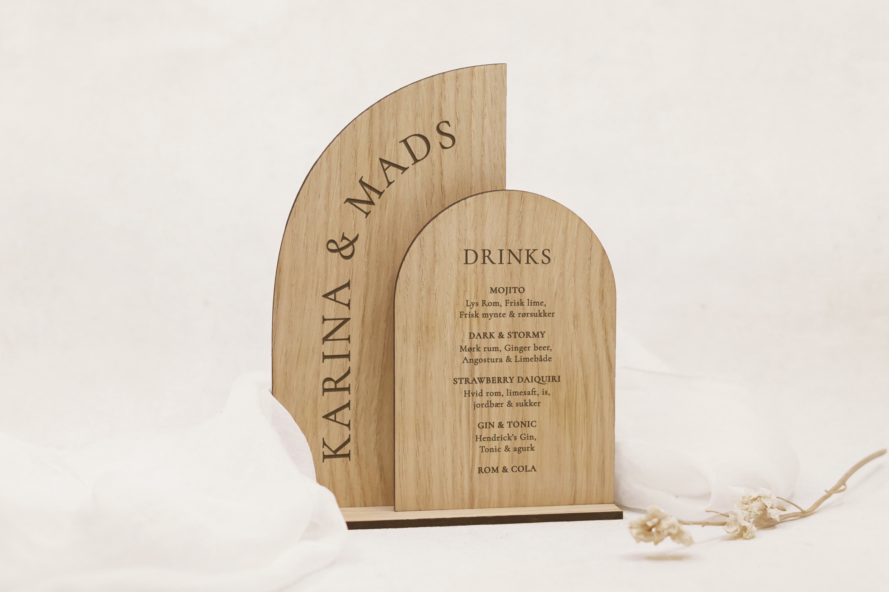 Dobbelt drinksskilt i træ med brudeparrets navne elegant fremhævet – en dekorativ og praktisk detalje til baren, der præsenterer jeres drinks med stil. Pris inkl. holder.