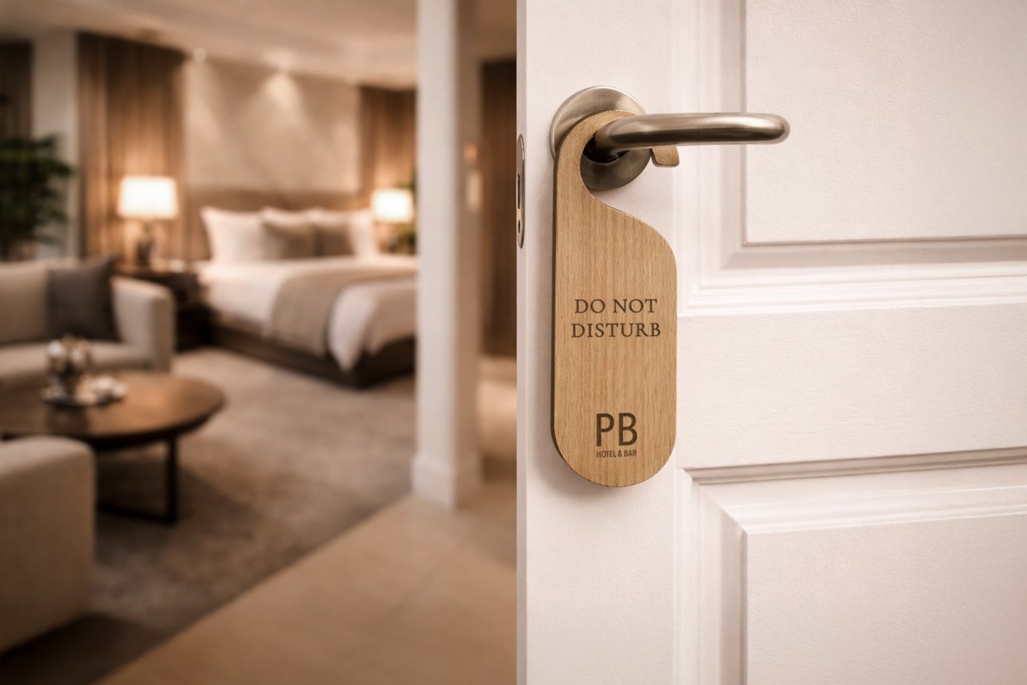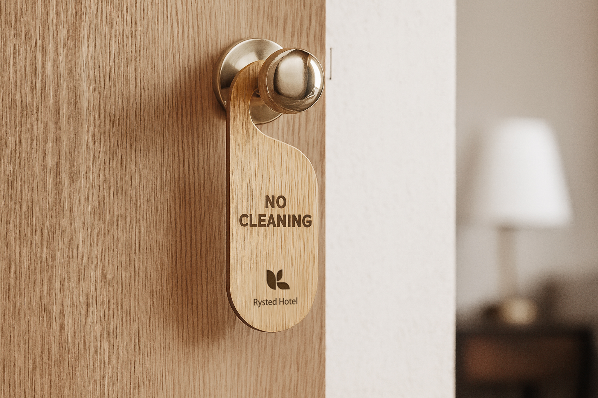 Dørhængere i træ med valgfri tekst og mulighed for logo, hvis det ønskes. Denne elegante og holdbare dørhænger tilføjer et professionelt præg til f.eks. hotelværelser, mødelokaler eller til kontoret.