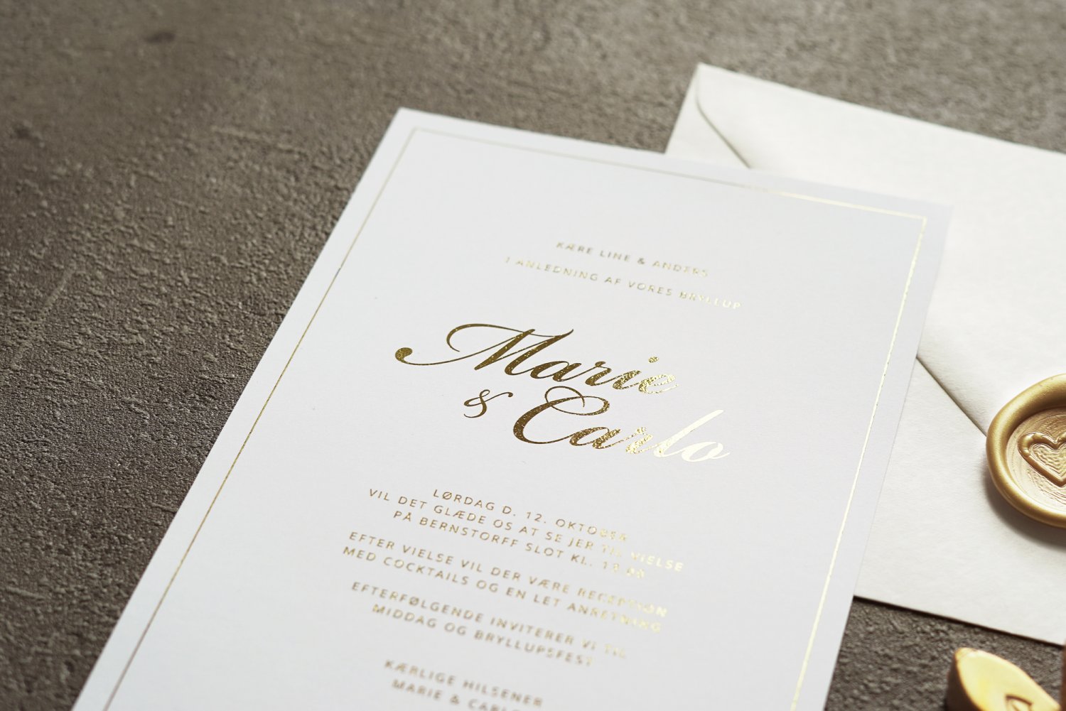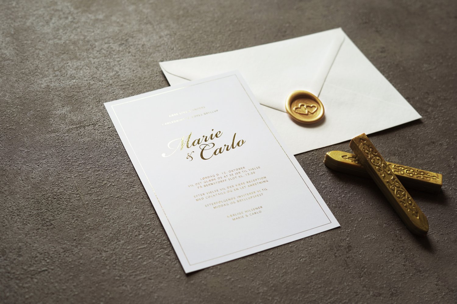 Invitation af semi-blankt karton med guld skråskrift folietryk og gyldent laksegl.