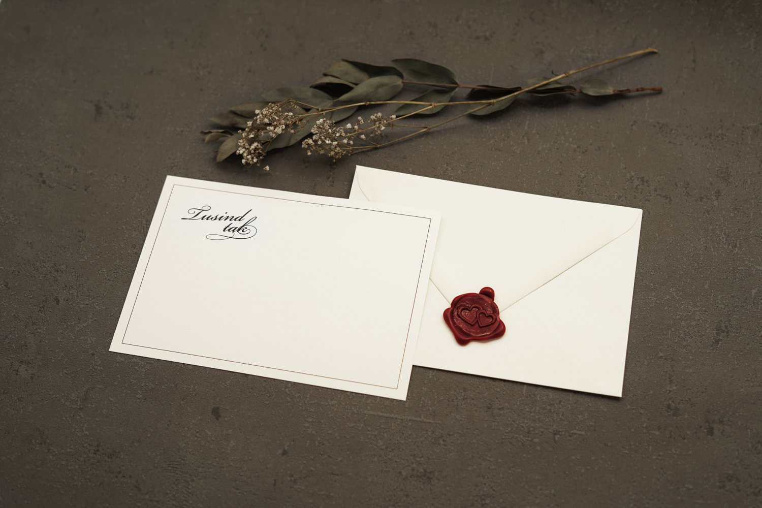 Tak gæsterne for deres deltagelse ved jeres store dag med håndlavede takkekort. På kortene er der trykt "Tusind tak", med plads nede under til at der kan skrives en personlig tekst i hånden til hver gæst. Ønskes en fortrykt tekst, ens på alle ark, sendes teksten i en email. Foto viser for- og bagside.