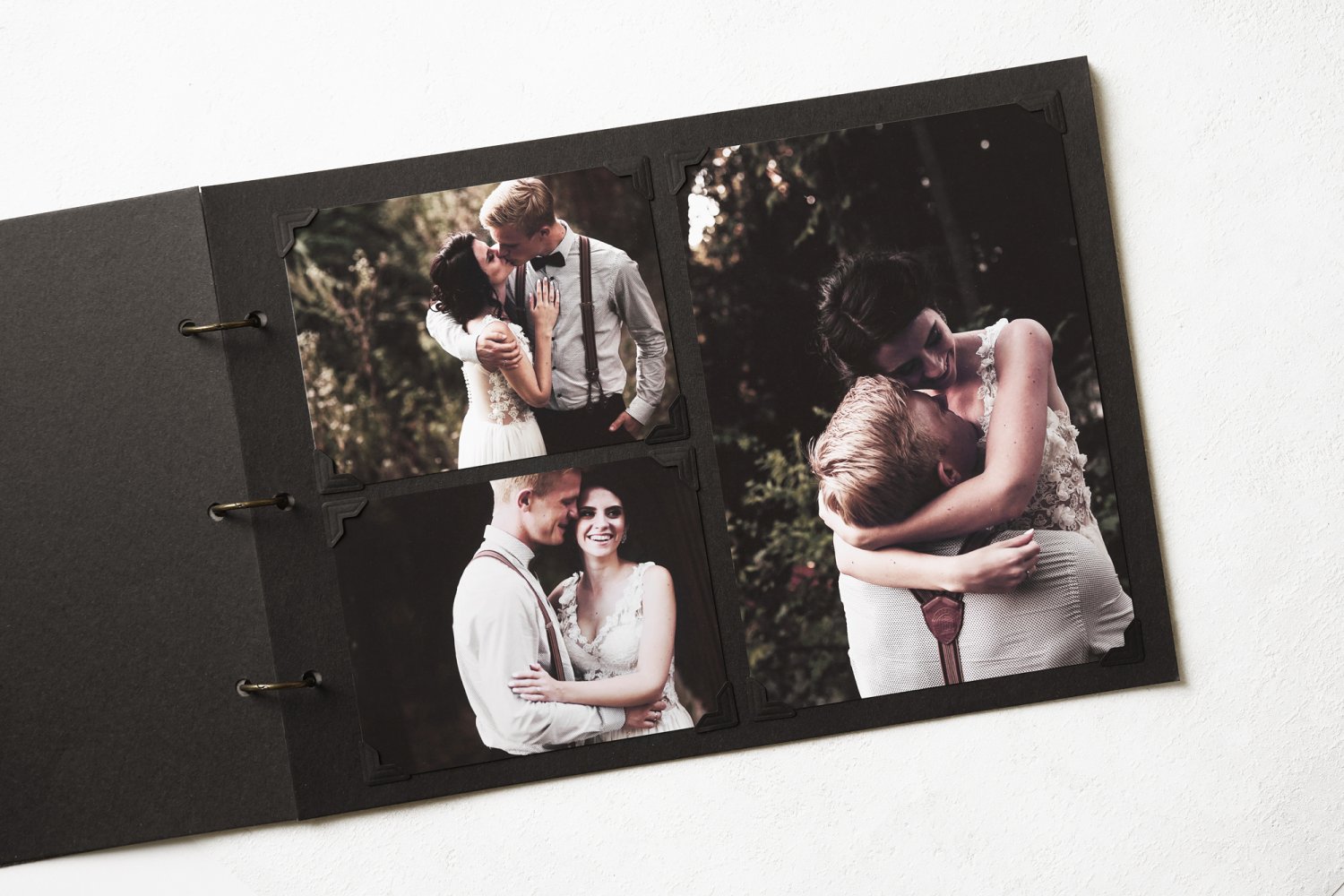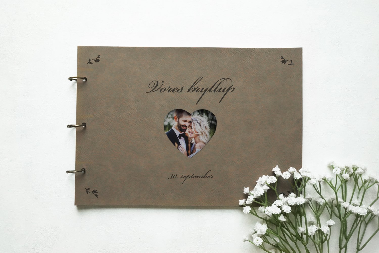 Saml alle de bedste bryllupsbilleder i et unik og personligt fotoalbum. Bryllupsdato og håndtegnede illustrationer graveres i læder, og i midten er der udskåret et hjerte, hvor det bedste billede fra dagen placeres, så det kan ses gennem forsiden. Inden i findes 25 stk. sorte sider, hvor fotohjørner kan placeres efter ønske. Bogen samles af tre messing ringe og er et skønt minde fra jeres store dag.