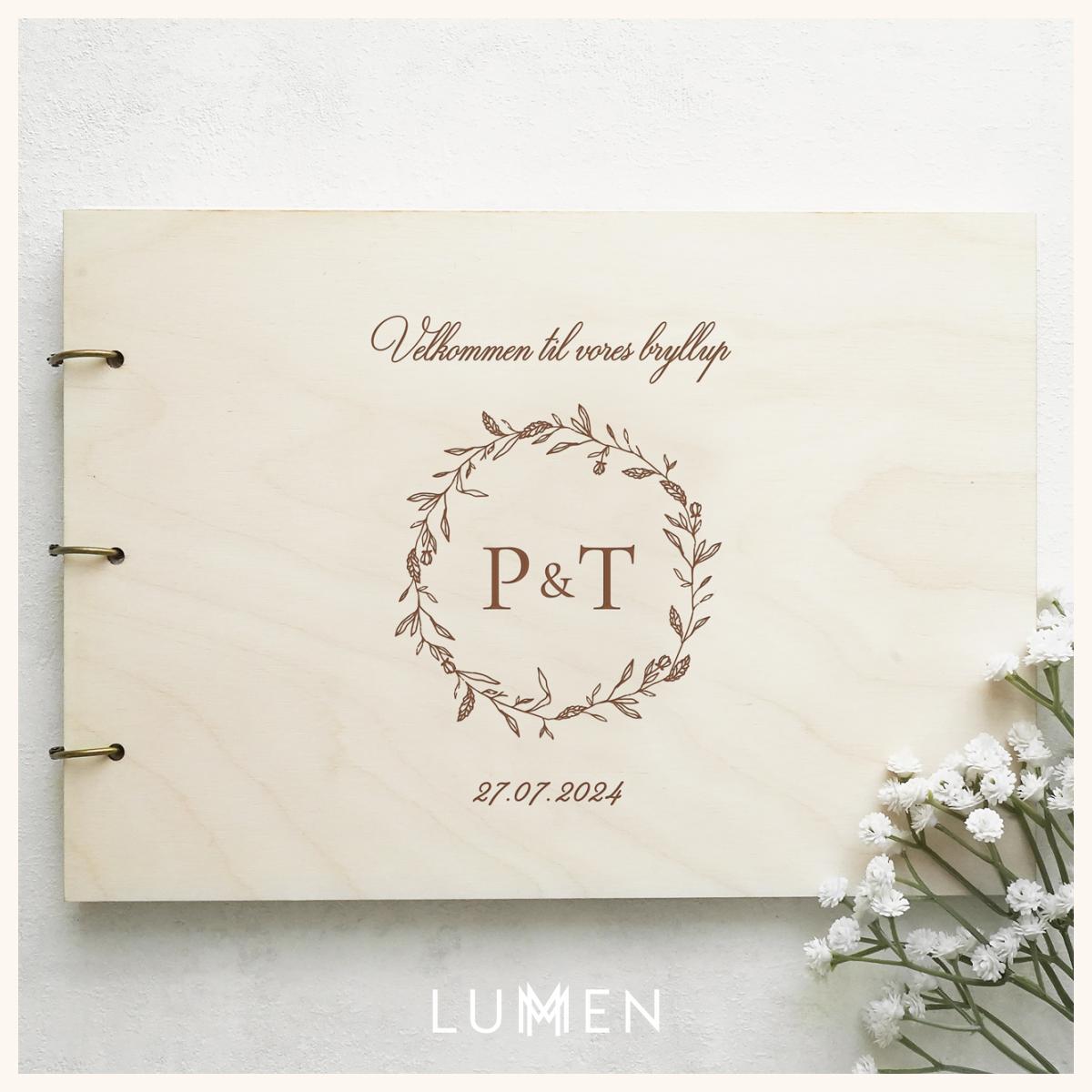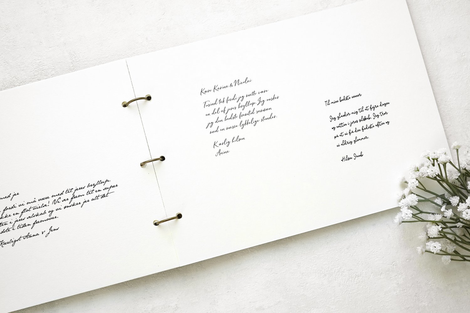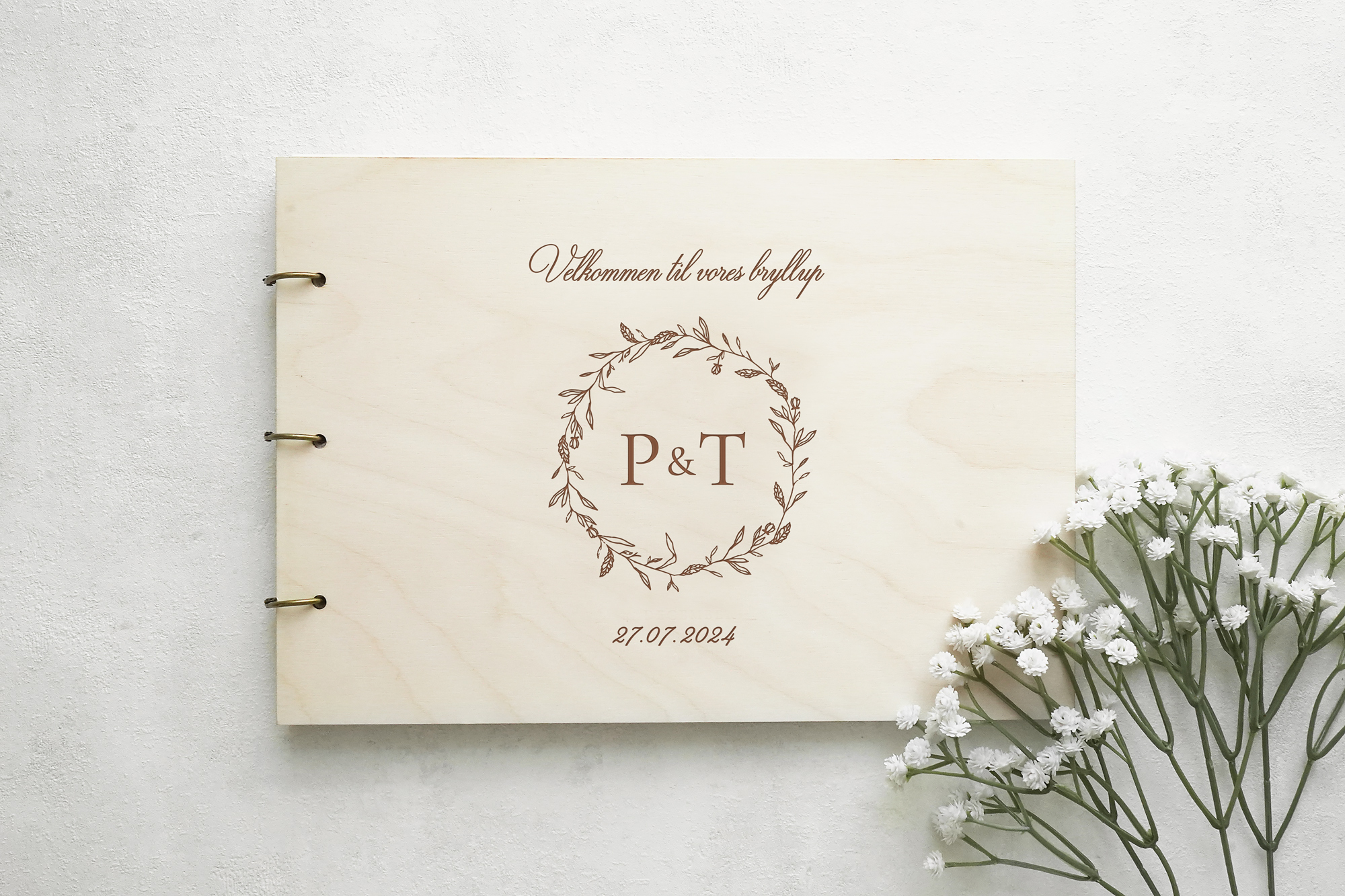 Få et evigt minde fra bryllupsdagen med denne unikke håndlavet og personligjorte gæstebog. Initialer/navne, håndtegnede illustrationer samt bryllupsdato graveres i træet. Bogen samles af tre metalringe og inden i findes 25 hvide ulinjeret sider, som indbyder til lykønskninger og hilsner fra jeres gæster. Et skønt minde fra jeres store dag.