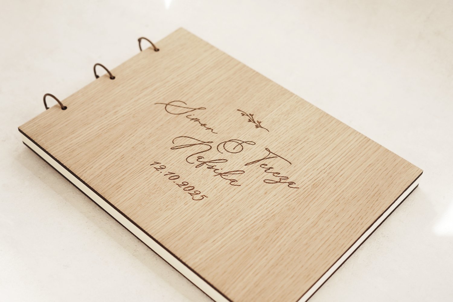 Få et evigt minde fra bryllupsdagen med denne unikke håndlavet og personligjorte gæstebog. Initialer/navne, håndtegnede illustrationer samt bryllupsdato graveres i træet. Bogen samles af tre metalringe og inden i findes 25 hvide ulinjeret sider, som indbyder til lykønskninger og hilsner fra jeres gæster. Et skønt minde fra jeres store dag.