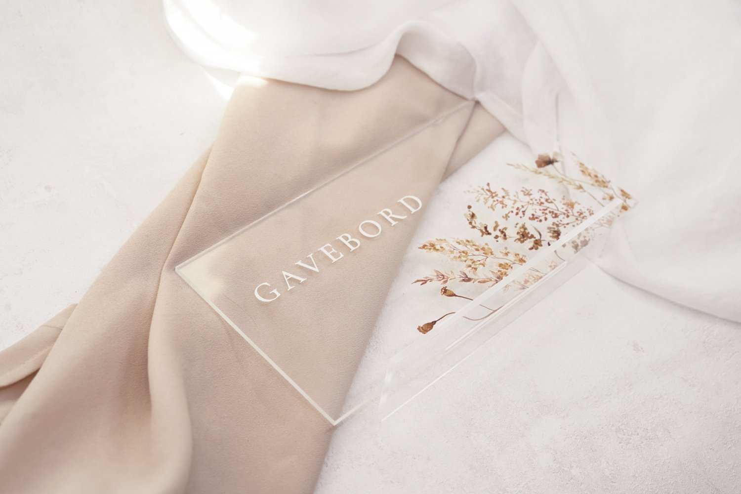 Dekorativt skilt i akryl til gavebordet, trykt med blomster og blade. Skiltet bruges som en henvisning til gæsterne om hvor de kan lægge deres kort og gaver.