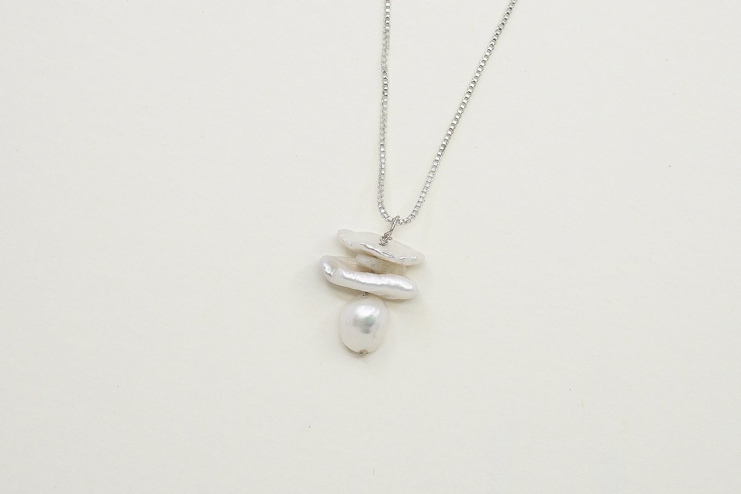 Guinevere halskæde med vedhæng af ferskvandsperler, naturligt fremstillet i havet, samt en månesten på en enkel kæde. Perlerne er specifikt udvalgt, så de tilsammen skaber et unikt vedhæng.