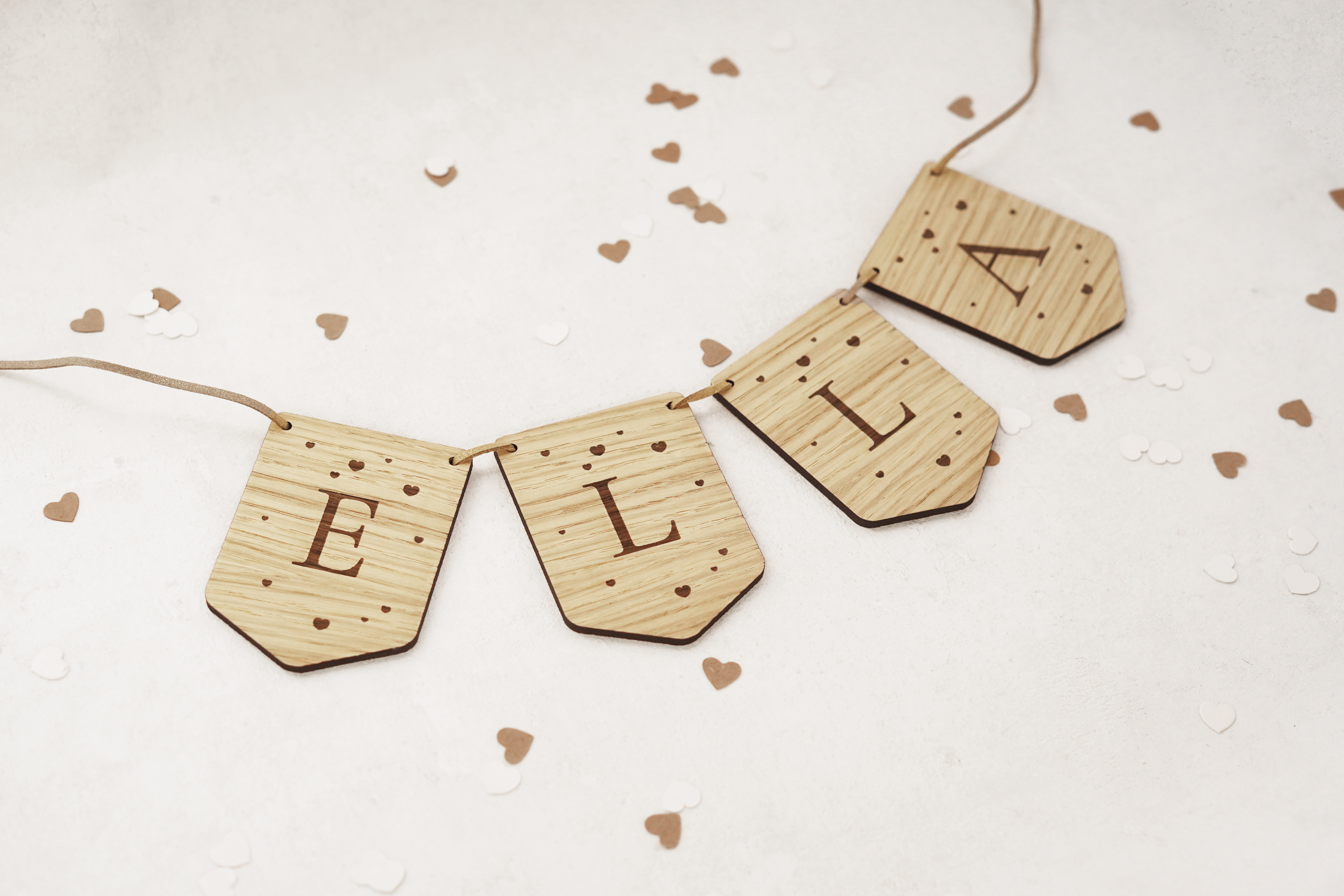 Sød guirlande med valgfrit navn i træ til børneværelset. Hver træflag graveres med bogstav, som samlet giver det ønskede navn. Træflagene er dekoreret med hjerter og hænges på lædersnørre. En hyggelig guirlande til at hænge langs børnesengen eller på væggen.