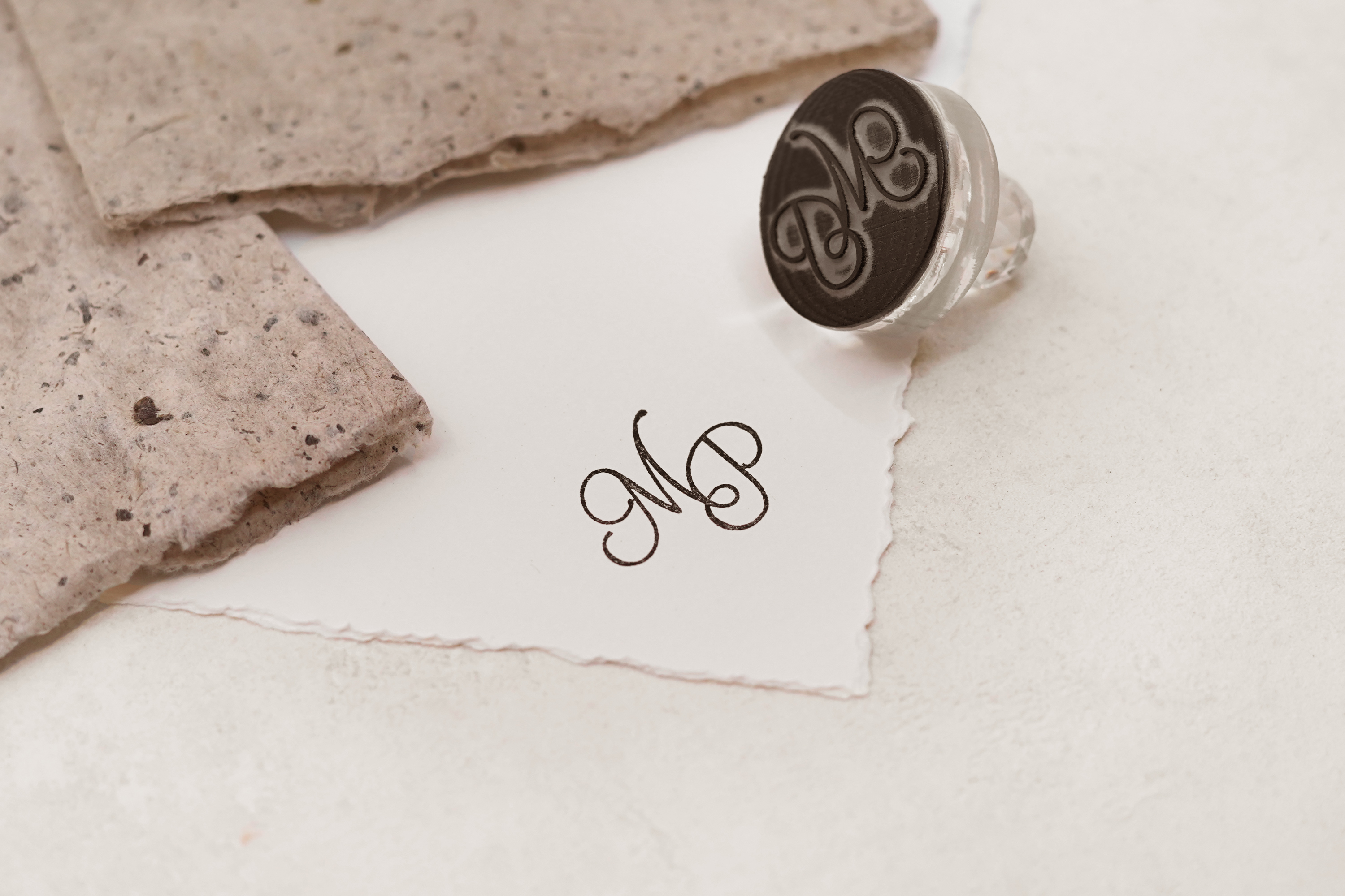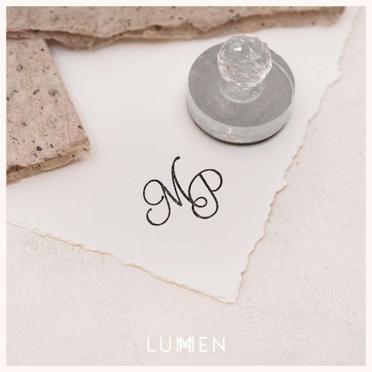 Gummistempel med unikt monogram og elegant krystalformet håndtag. Det dekorative håndtag giver et eksklusivt udtryk og ligger godt i hånden. Perfekt til at sætte et personligt præg på invitationer, konvolutter og andre tryksager.