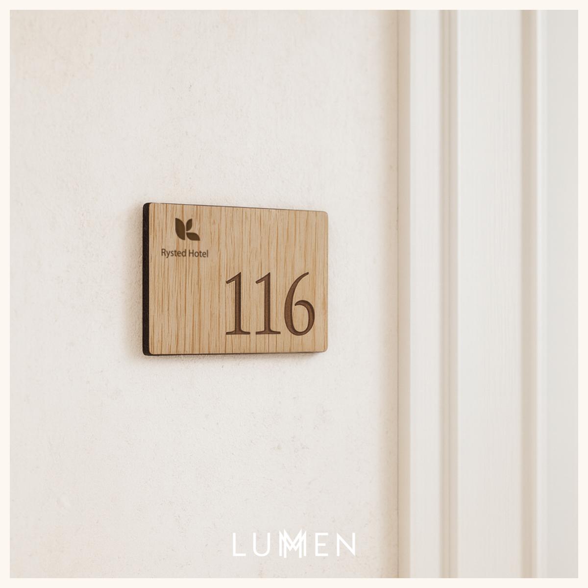 Hotel værelsesnumre i træ med graverede numre og logo – elegant og holdbart design, der kombinerer naturlig varme med professionelt udtryk. Perfekt til hoteller, hvor detaljer og kvalitet betyder noget.