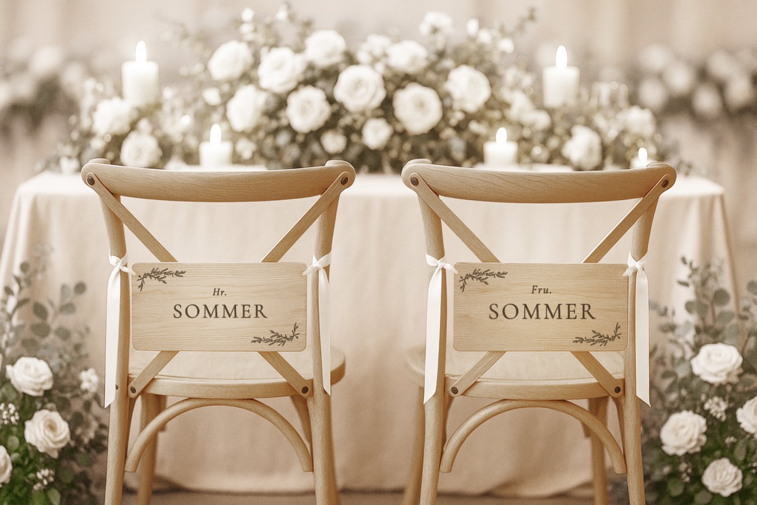 Firkantede Hr. & Fru. skilte til stole i træ, en smukt og klassisk detalje til brylluppet. Skiltene hænger elegant på stoleryggen og markerer pladserne til brudeparret med varme og personlighed.