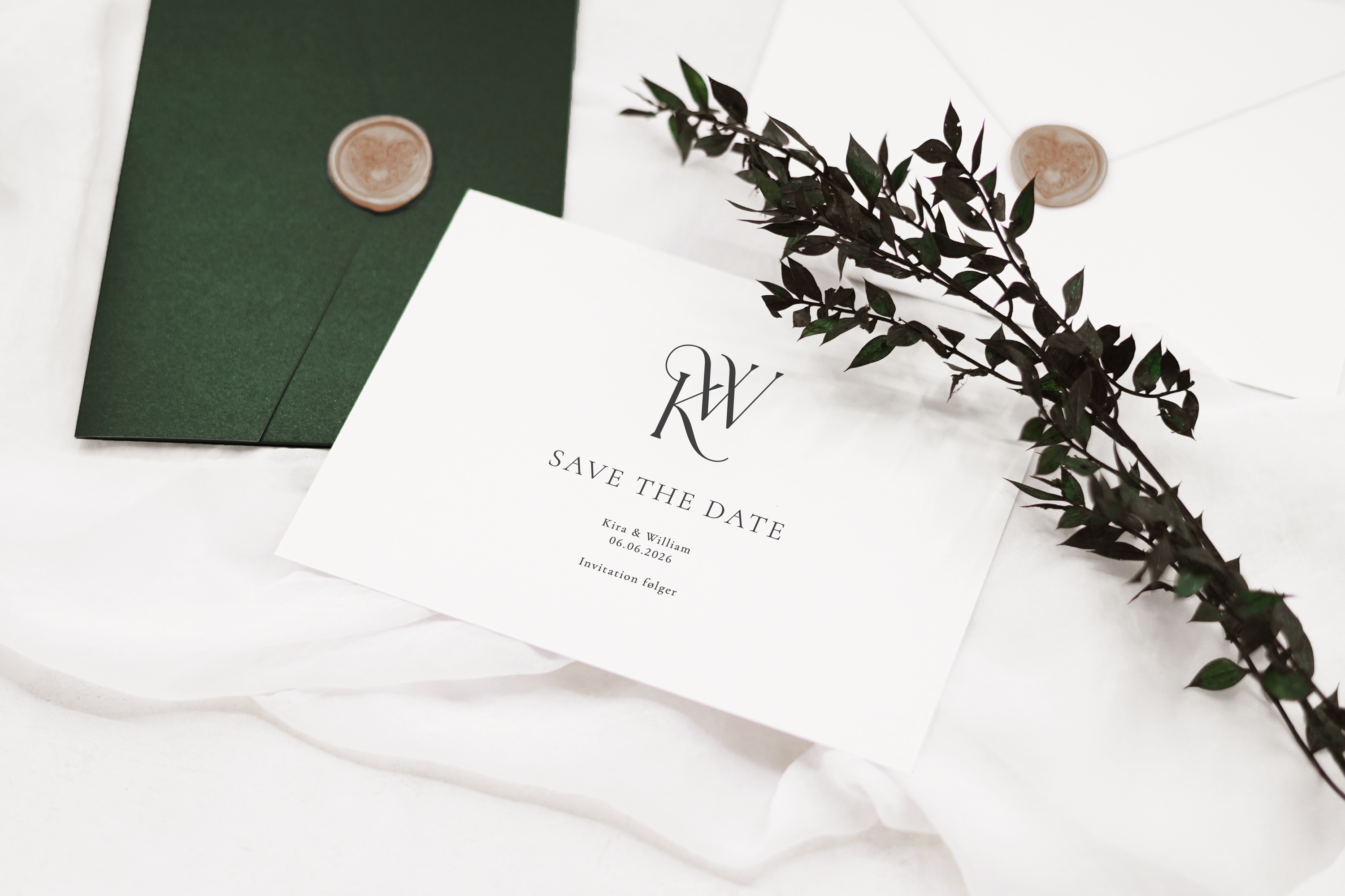 Save the Date kort med et valgfrit, personliggjort monogram, der giver en eksklusiv og unik detalje. Perfekt til at annoncere jeres bryllupsdato med et stilfuldt og personligt præg.