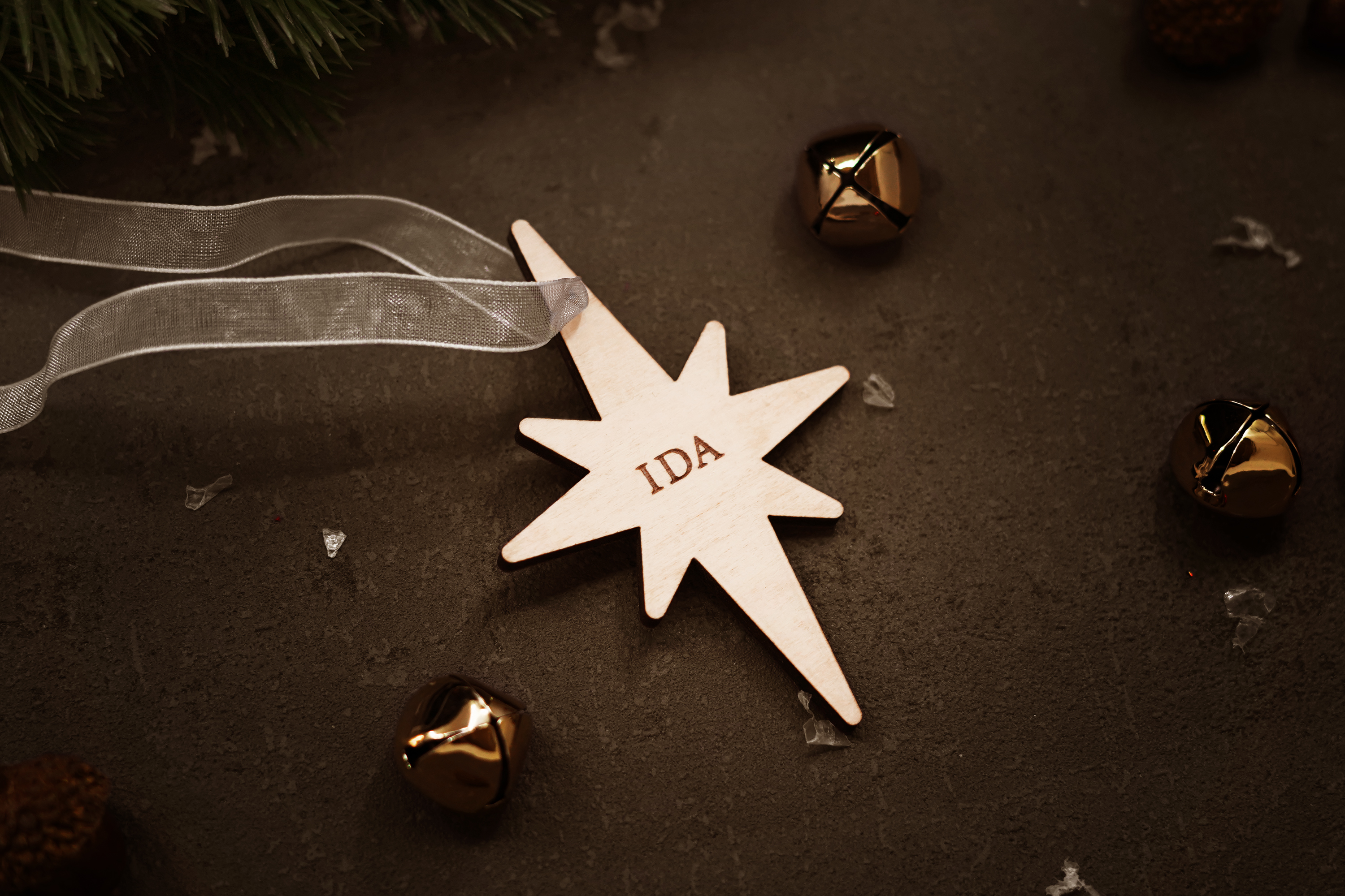 Gør julen endnu mere speciel med vores personliggjorte julestjernemærker i akryl, skabt til at tilføje en ekstra glans til julestrømperne. Hver stjerne er udskåret i klar akryl og kommer med et unikt præg af et navn, hvilket gør det til en charmerende og personlig juledekoration.