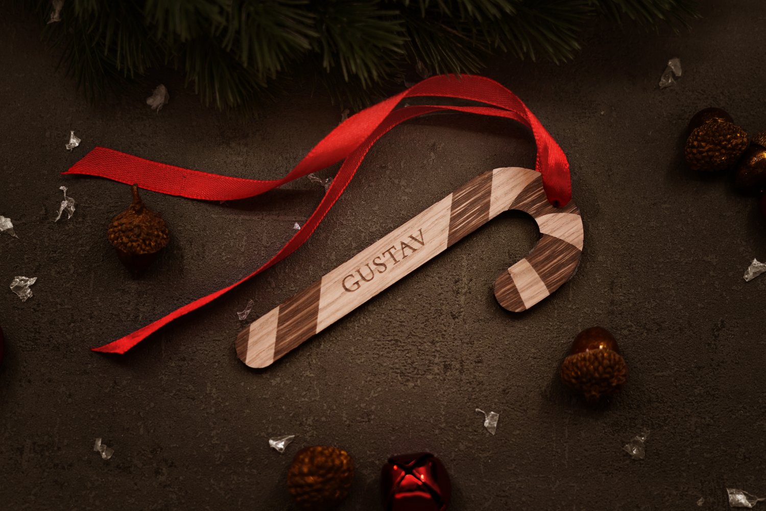 Jule slikstokke med graverede navne, tilgængelige i valgfri træsort, som også kan bruges som juleornamenter til juletræet. Perfekte som en personlig og festlig tilføjelse til juledekorationen.