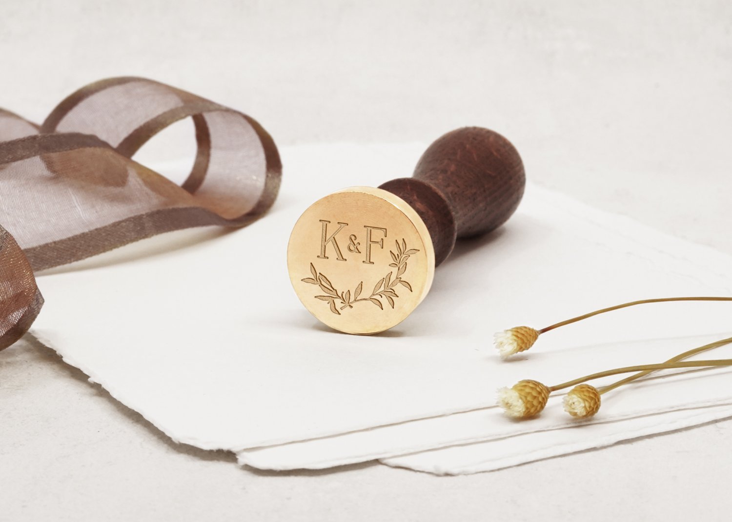 Forsegl bryllupsinvitationerne med et personligt og unikt laksegl stempel. Designet bliver som på fotoet, men fremtilles med brudeparrets initialer. Gæsterne vil elske at åbne deres invitationer, når de ser det smukke aftryk på omslaget om invitationen og bagsiden af kuverten, så glem alt om klisterbånd og lim! Ønskes monogrammet også digitalt, kan det tilkøbes her: Monogrammer »