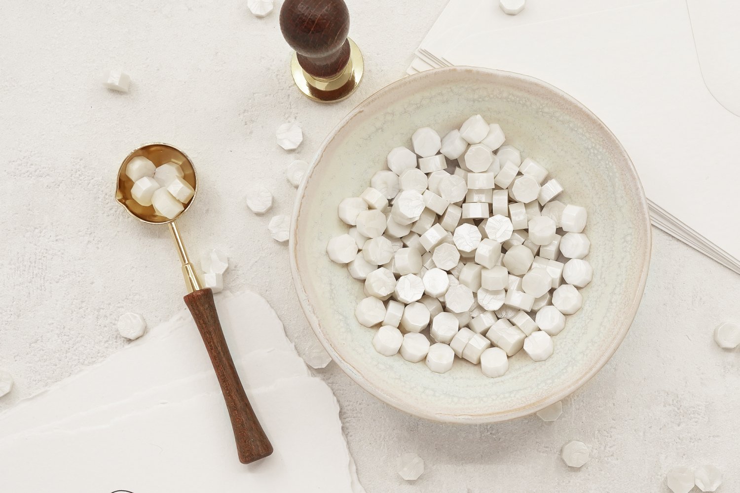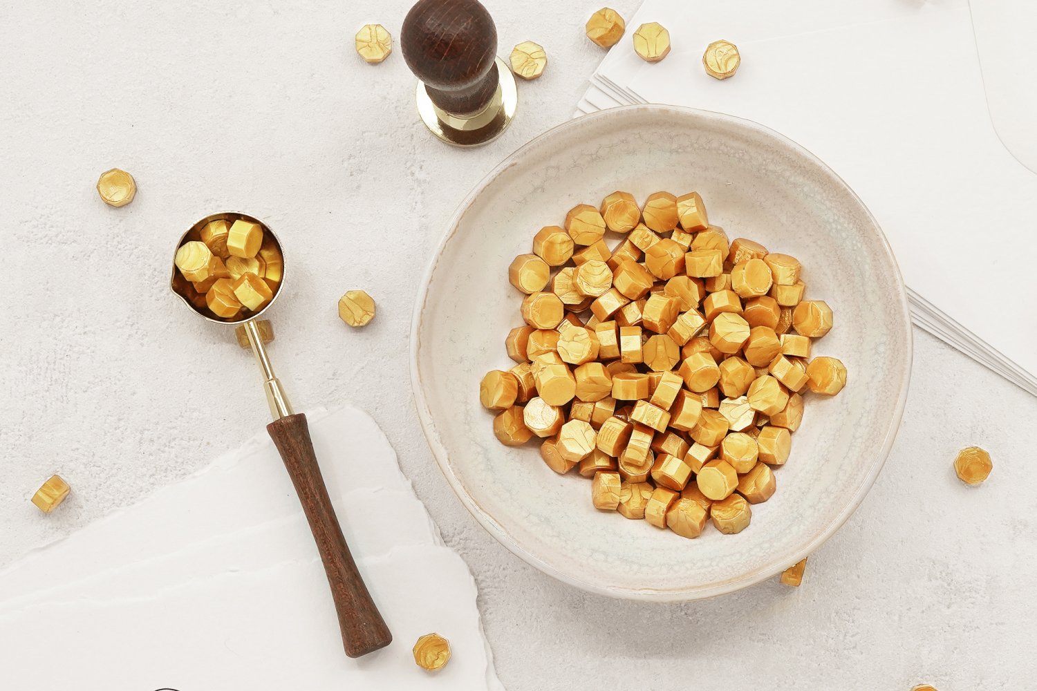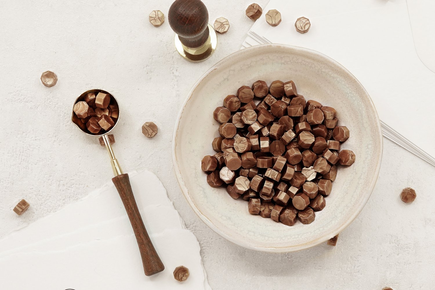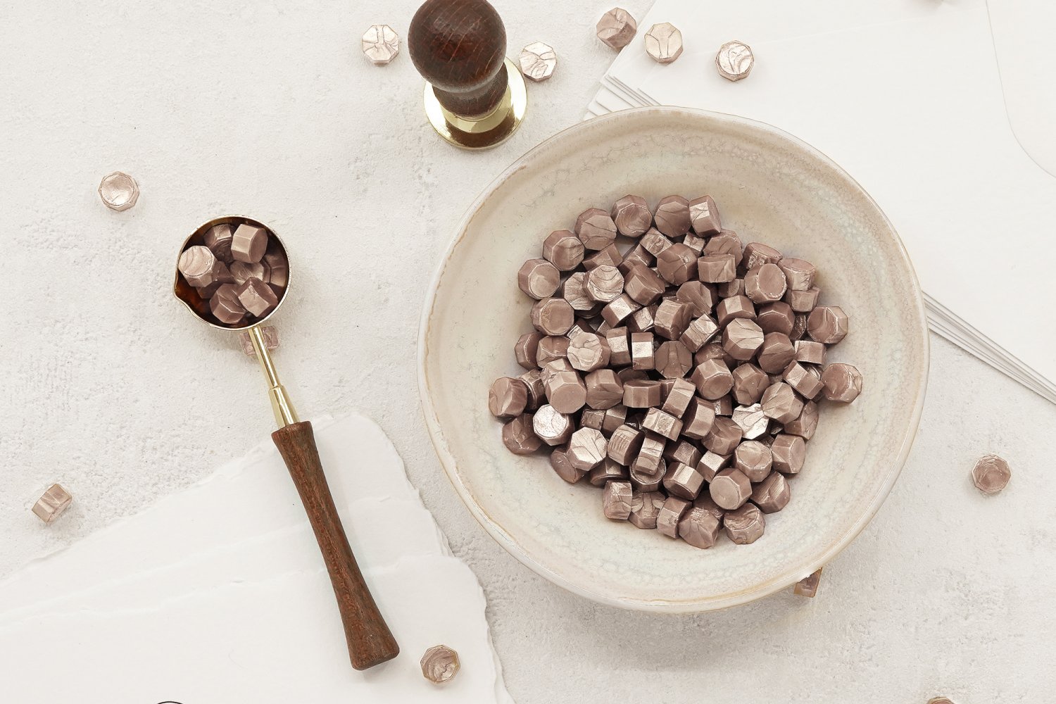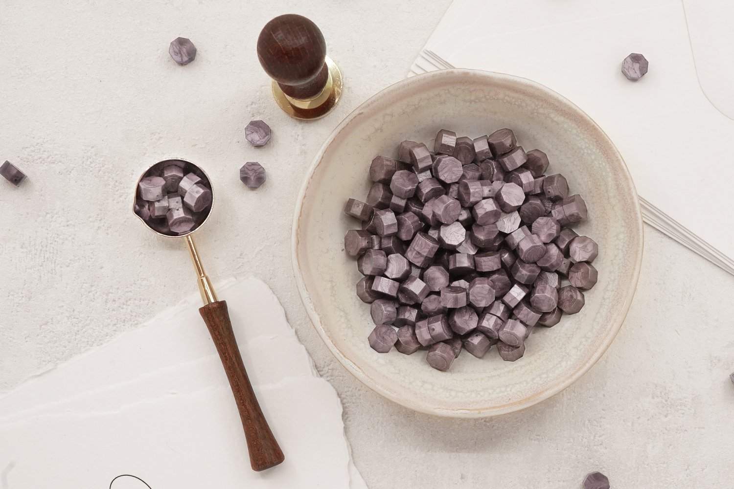 60g er ca. 185 stk. laksegl stykker. Antallet af vokssegl afhænger af stemplets størrelse. Forhandles uden skål, papir og konvolutter og laksegltilbehør.