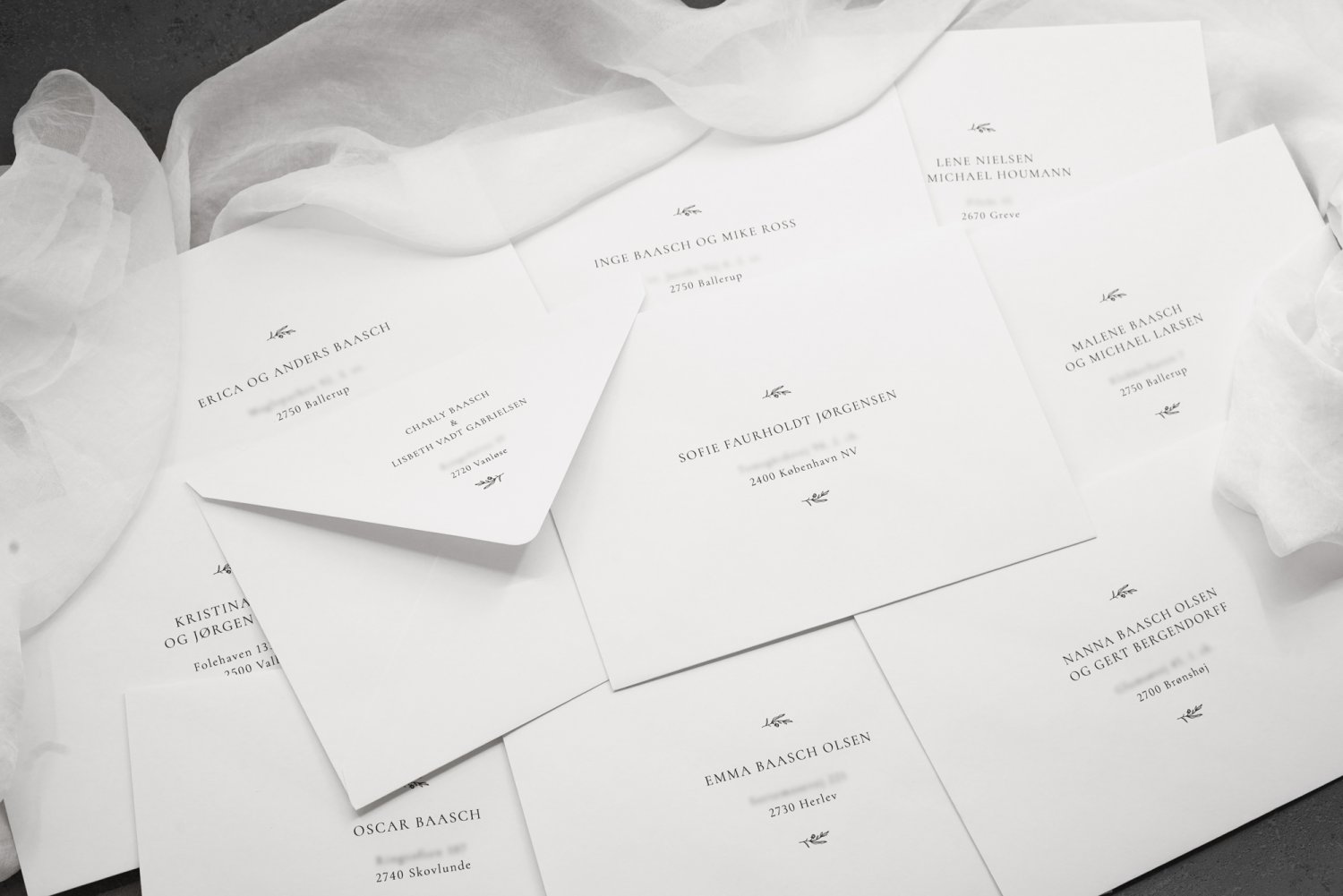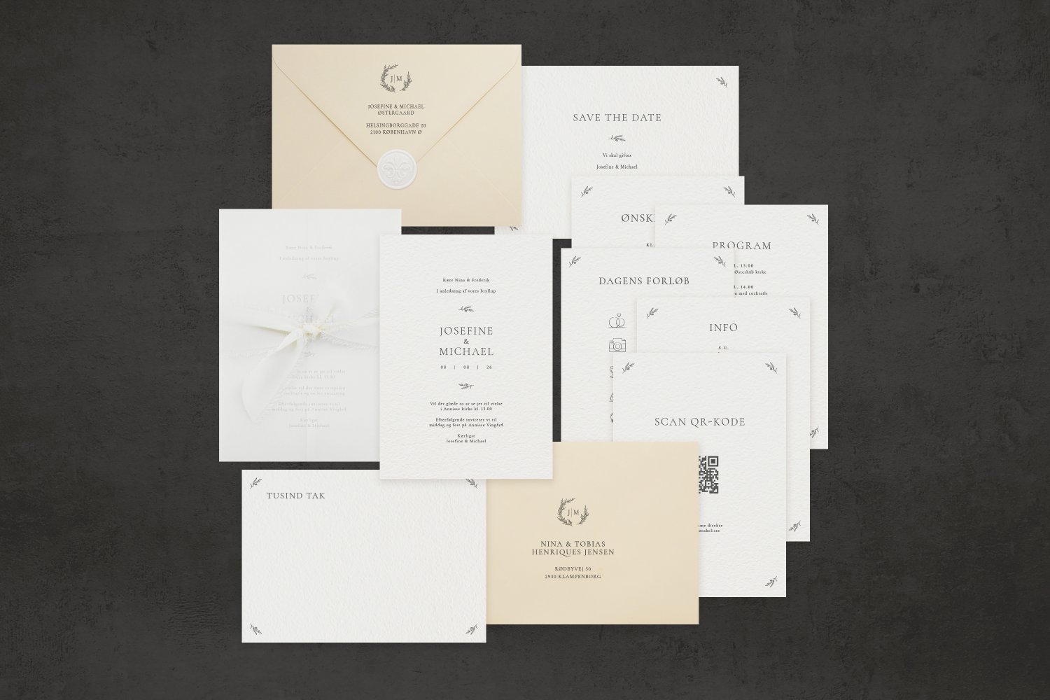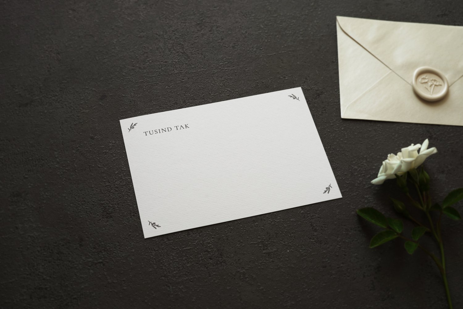 Elegante takkekort dekoreret med små håndtegnede roser og trykt med “Tusind tak”, med plads til en personlig håndskrevet besked til hver gæst. Forsiden kan tilpasses med et foto af brudeparret, deres navne og bryllupsdato, hvilket giver et personligt præg til jeres takkehilsener efter brylluppet. Ønskes en fortrykt tekst på bagsiden, ens på alle ark, sendes teksten i en email. Foto viser for- og bagside.