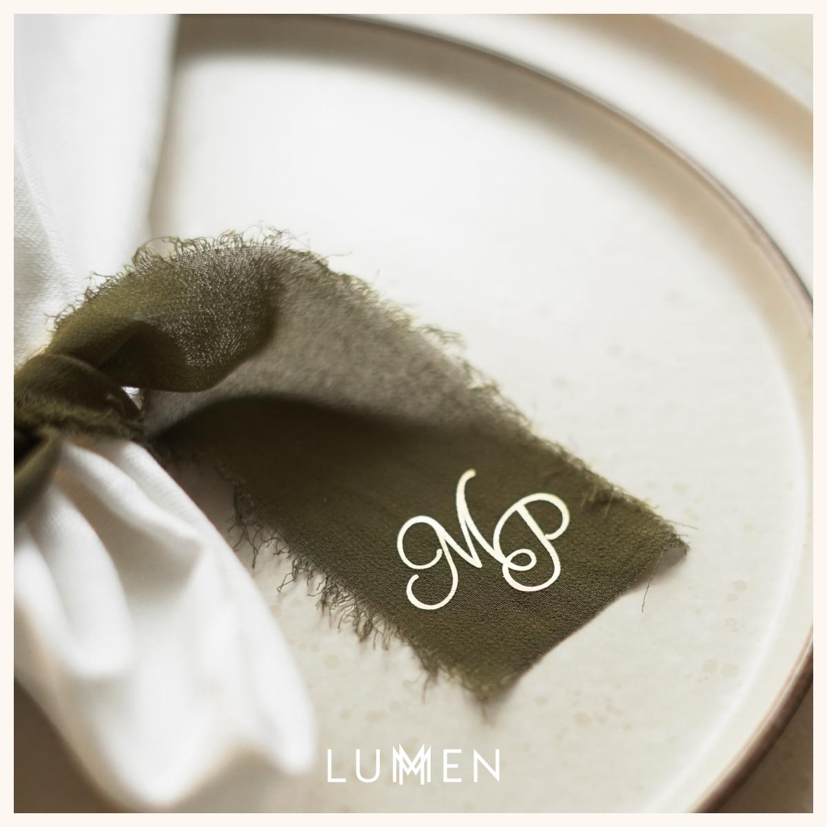 Lange stofbånd som elegante bordpynt, trykt med valgfrit monogram. En smuk og personlig detalje, der tilfører borddækningen et unikt og eksklusivt præg.