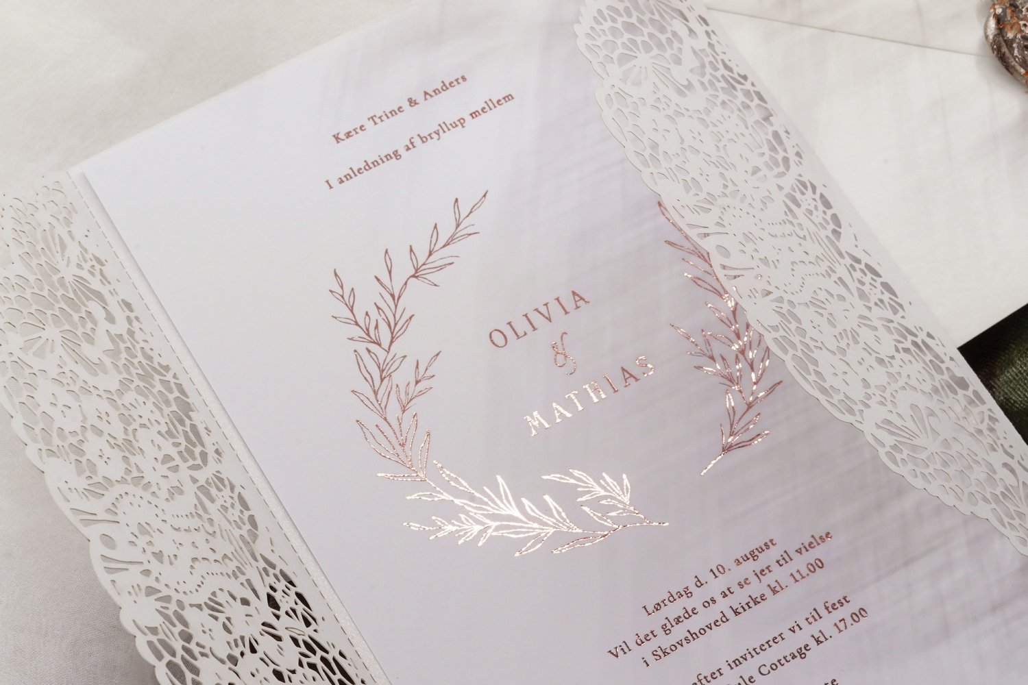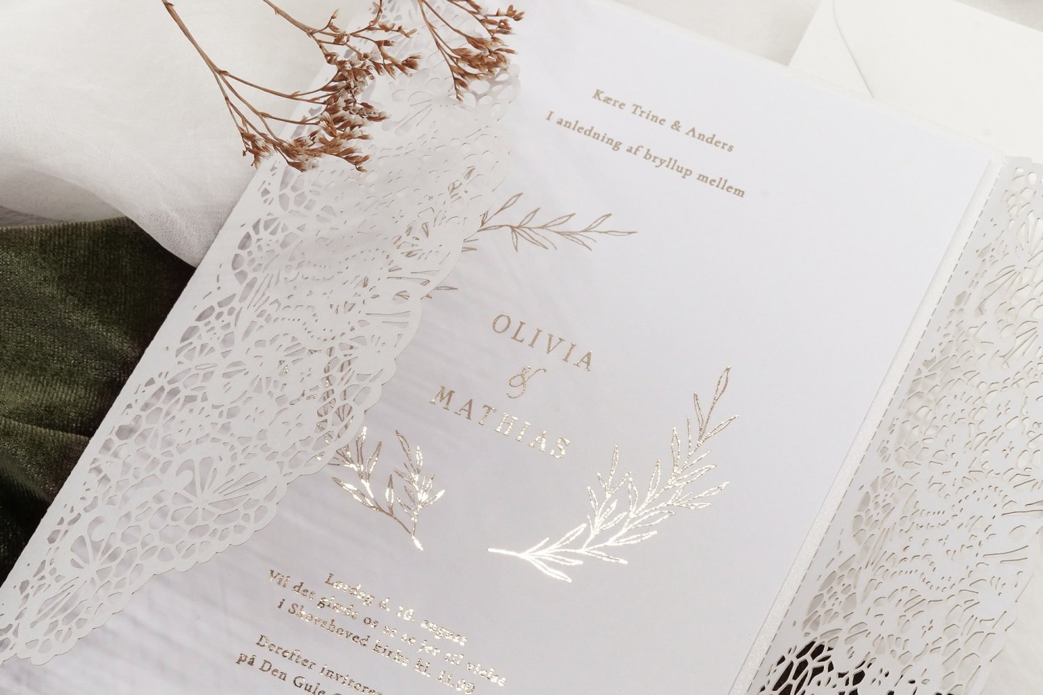 Lavelle kollektionen udstråler luksus og elegance med deres folieskrift i valgfri farve og en smukt designet bladkrans, der omkredser brudeparrets navne samt en personlig tekst. Et design, der fanger opmærksomheden og skaber en mindeværdig første indtryk.