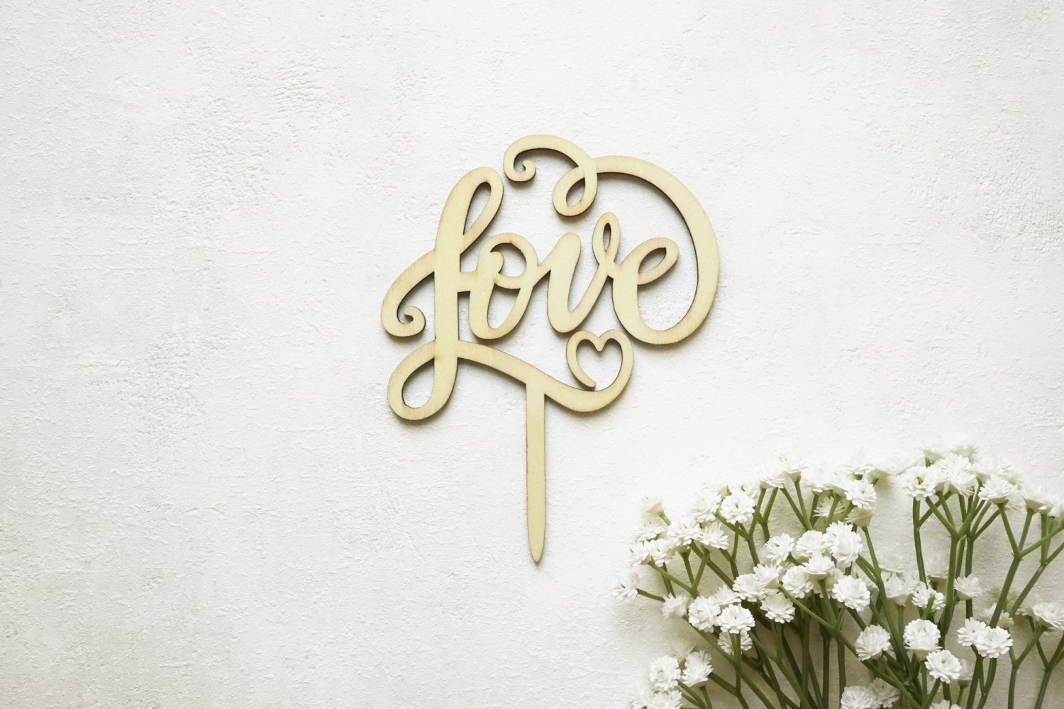 Prikken over i'et på bryllupskagen er caketopperen. Denne kagetop har ordet "Love" i kalligrafiskrift samt et lille hjerte.
